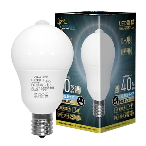 LED電球 E17口金 人感センサー 電球 40W形相当 昼白色 5000K 5W 500lm 自動点灯・消灯 明暗センサー付 消し忘れ防止