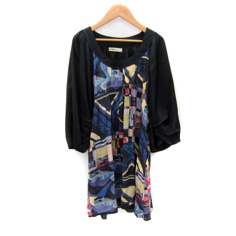 【中古】ローズバッド ROSE BUD ワンピース ひざ丈 長袖 ラウンドネック 総柄 マルチカラー F ブラック レディース