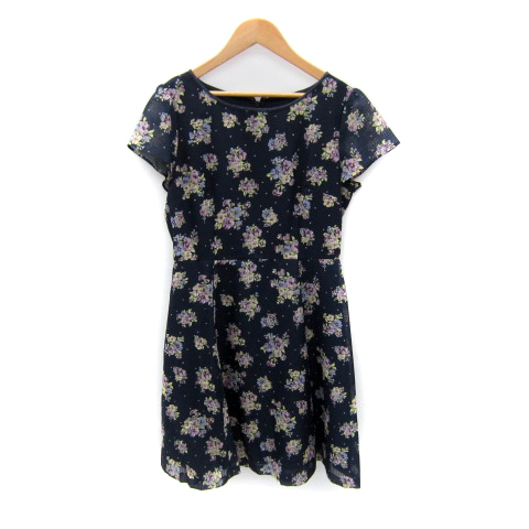 【中古】エニィスィス エニシス ワンピース ひざ丈 半袖 花柄 マルチカラー シースルー 2 紺 ネイビー レディース