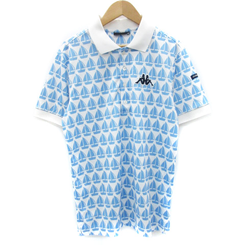 【中古】カッパ kappa ポロシャツ 半袖 ポロカラー 総柄 刺繍 M ホワイト 白 ライトブルー 水色 /YM27 レディース
