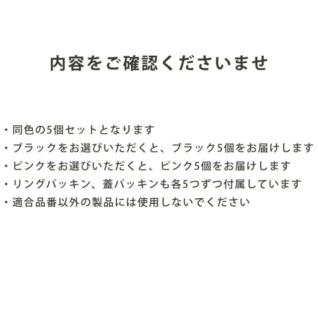 | 備考 | ・同色の5個セットとなります ・ブラックをお選びいただくと、ブラック5個をお届けします ・ピンクをお選びいただくと、ピンク5個をお届けします ・リングパッキン、蓋パッキンも各5つずつ付属しています ・適合品番以外の製品には使用しないでください |