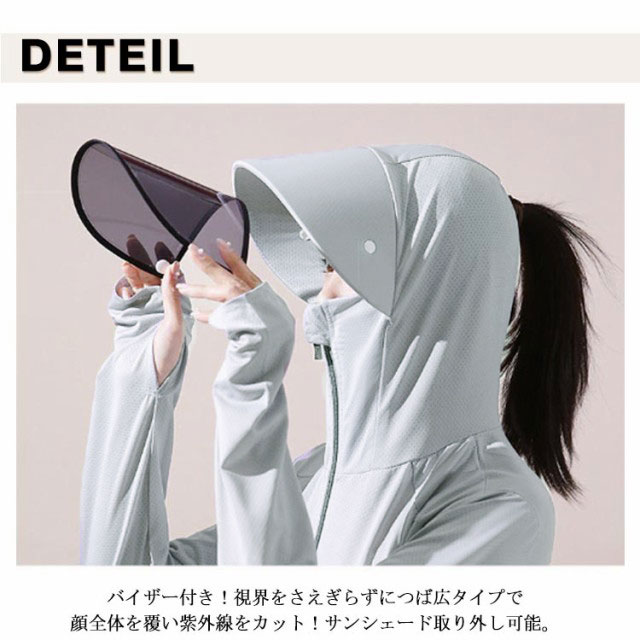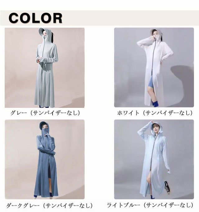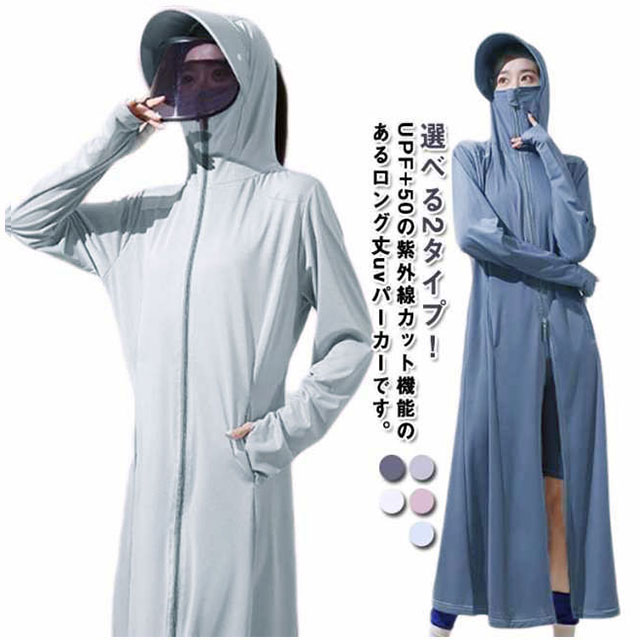 | 選べる2タイプ!UPF+50の紫外線カット機能のあるロング丈uvパーカーです。 薄手で速乾性のあるサラサラの着心地で快適に過ごせます。 ひんやりと冷たくシャリ感のある生地が汗ばむ季節でも快適に。 指ぬき付きで手の甲まで日焼けから守ってくれます! ストレッチの効く素材で締め付け感もありません。 長めのミモレ丈で太もも・お尻周りもしっかりカバーしてくれます。 バイザー付き!視界をさえぎらずにつば広タイプで顔全体を覆い紫外線をカット!サンシェード取り外し可能。 適用シーン!自転車、通勤、通学、バイク、運転、サイクリング、旅行、登山、釣りなどのお出かけにはもちろん、ビーチや海、レージャなどのアウトドアスポーツにも大活躍です。 | |