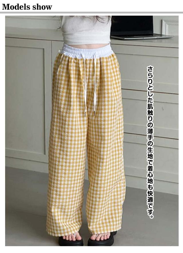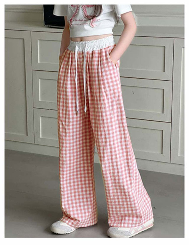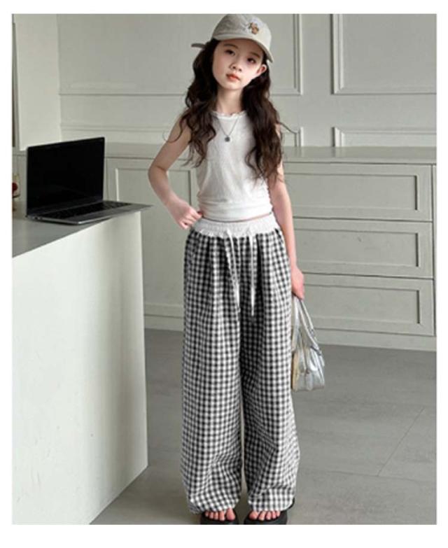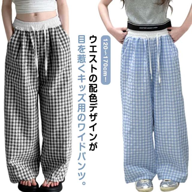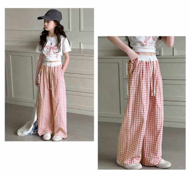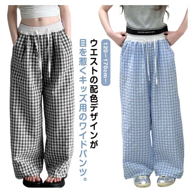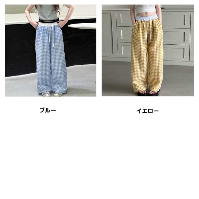 キッズ ワイドパンツ チェック柄 韓国風 ロングパンツ ウエスト 配色 可愛い 夏 蚊よけパンツ 薄手 イージーパンツ 女の子 子供服 ゆったり ガウチョパンツ 長ズボン キッズ ジュニア 女児 女子 子ども こども 通学 通園 普段着 送料無料