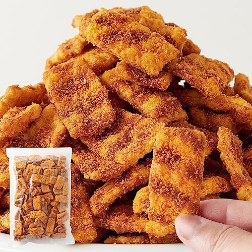 ■商品名:ミニソースカツ ■名称:魚介加工品 ■原材料名:植物油(国内製造)、パン粉、小麦粉、濃厚ソース、魚肉シート(魚肉すり身、全卵、植物性たん白、でん粉、植物油、食塩、香辛料)、でん粉、香辛料、卵白、たん白加水分解物、植物性たん白、食塩/ソルビトール、グリセリン、加工でん粉、調味料(アミノ酸等)、トレハロース、膨張剤、着色料(カラメル、カロチノイド)、増粘剤(加工でん粉、タマリンド)、甘味料(カンゾウ)、(一部に小麦・卵・大豆・鶏肉・豚肉・もも・りんごを含む) ■内容量:500g ■賞味期限:製造より常温120