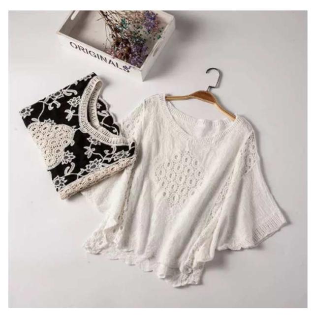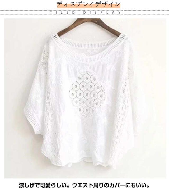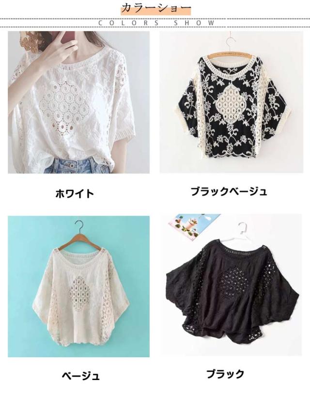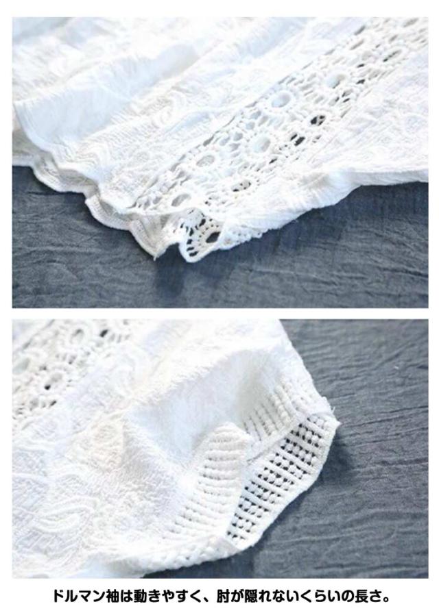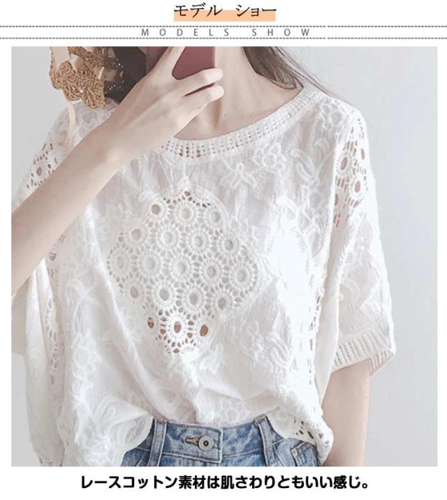 レディース コットン レーストップス シースルー 半袖 ホワイト Tシャツ 夏 トップス ブラウス ドルマンスリーブ 花柄 透かし彫り ドルマン 透け 透け感 綿 プルオーバー 無地 レース ブラック 体型カバー 刺繍 ゆったり カジュアル風 可愛い
