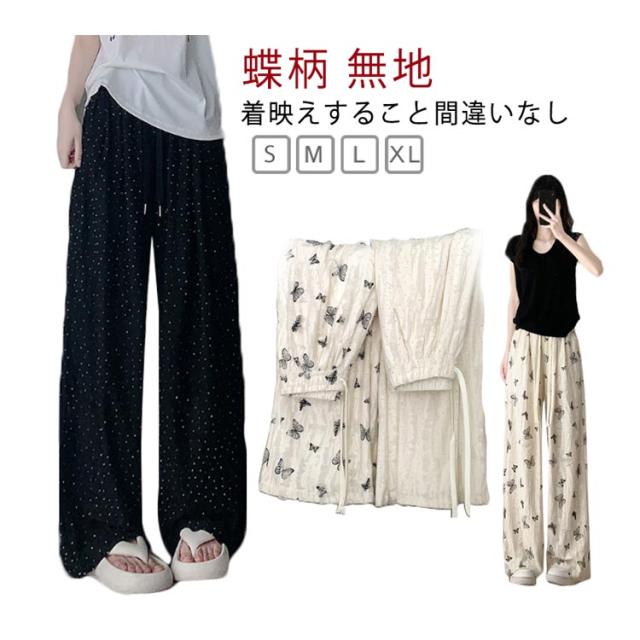 ワイドパンツ クラッシュ ビジュー付き ワイド ダメージ加工 バギーパンツ 無地 ガウチョパンツ ウェストゴム レディース 蝶柄 ロングパンツ ブーツカット 9分丈 パンツ ポケット付き 春 夏