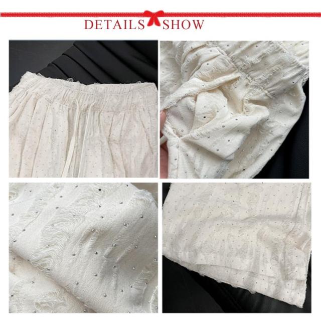 | 着映えすること間違いなし ビジュー付きダメージ加工ワイドパンツ。 軽くて柔らかい、ドレープたっぷりで動きで魅せるガウチョパンツ。 毎日のコーデを一気に格上げしてくれるビジューワイドパンツ。 無地と蝶柄の2タイプ×3着丈展開で、低身長も高身長も自分にピッタリのサイズが選べる。 個性あふれるダメージ加工、存在感抜群! | |