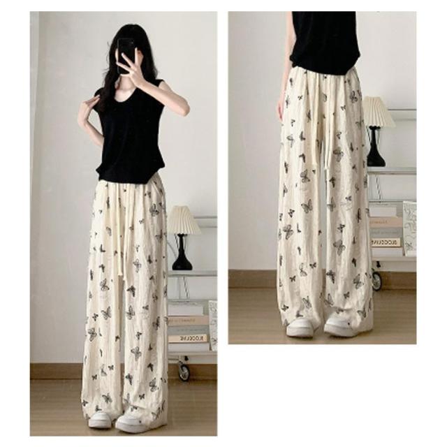 ワイド ワイドパンツ ダメージ加工 ダメージ加工 ウェストゴム 蝶柄 無地 バギーパンツ ガウチョパンツ レディース ブーツカット ロングパンツ クラッシュ 9分丈 パンツ ポケット付き 春 夏