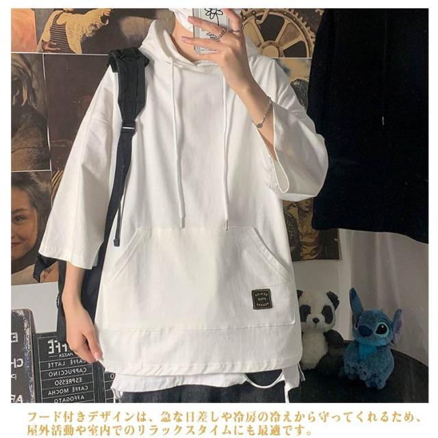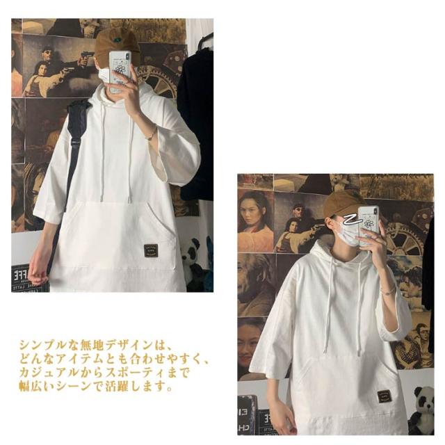 5分袖パーカー 半袖 夏用パーカー メンズ パーカー ビッグパーカー 半袖 メンズファッション ドルマン 5分袖 フード付きtシャツ パーカー 無地 夏服 メンズ ドルマン 春服 半袖 個性的 無地パーカー トップス プルオーバー