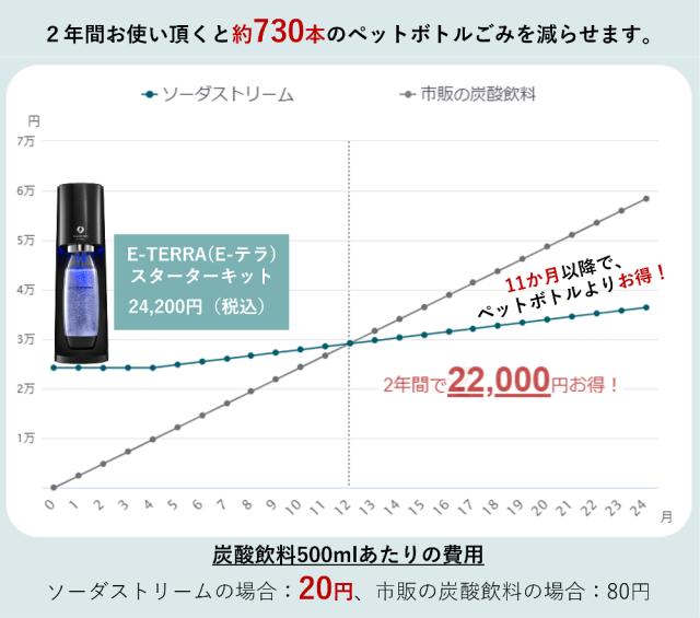 ※上記は、ご家庭で1日1本500mlの炭酸水を飲んだ場合に、ソーダストリームなら約20円、市販の炭酸水の場合は80円として試算した結果になります。
