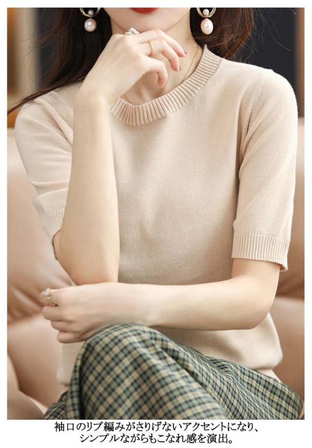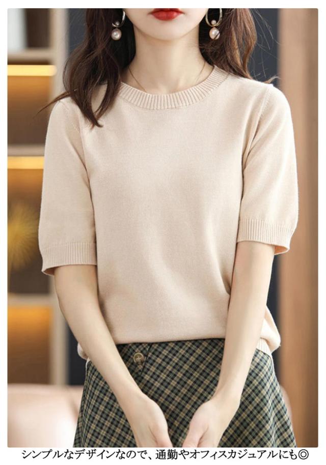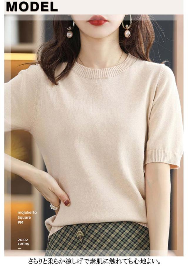 | 綿 レディース半袖のサマーニット。 さらりと柔らか涼しげで素肌に触れても心地よい。 袖口のリブ編みがさりげないアクセントになり、シンプルながらもこなれ感を演出。 シンプルなデザインなので、通勤やオフィスカジュアルにも◎ | |