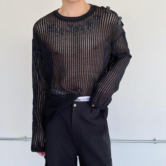 Tシャツ メンズ カジュアル 半袖 ニット ダンスウェア 丸首 透け感 発表会 白黒 ライブ ヒップホップ キャバクラ 舞台衣装 上着 スタイリッシュ 男子 トップス