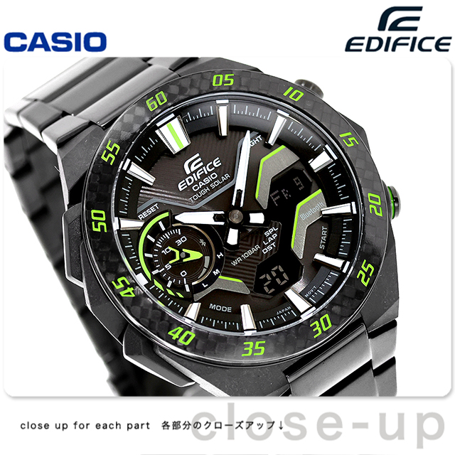 7年保証キャンペーン エディフィス EDIFICE ウィンドフロー ソーラー Bluetooth 海外モデル ソーラー メンズ 腕時計 ECB-2200RC-1A3DF WINDFLOW アナデジ ブラック ◆レーシングマインドを駆り立てる、スピードを想起させるカラーリングを纏ったウィンドフロー。フォーミュラカーを駆け抜ける風の流れを表現。カーボンファイバー強化樹脂ケース、カーボンファイバー製ベゼル、ブラックイオンプレーティングステンレススチールバンドが、レーシングトラックを彷彿とさせます。Bluetoothでスマートフォンと簡単に同期。アプリを起動すれば、自動調整された高精度な時刻表示、世界300都市以上のワールドタイム、ミリ秒単位で計測されたストップウオッチデータのスマートフォンへの転送など、外出先で役立つ機能が満載です。タフソーラー搭載で、太陽光や室内の光でも充電可能です。 日本未発売モデル