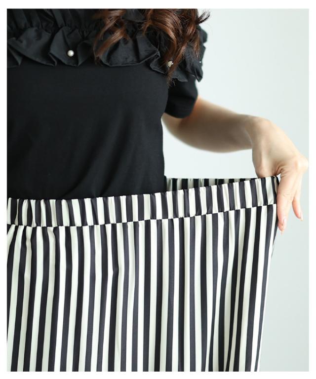 特徴: ボーダー ストライプ ティアード 切り替え ウエストゴム フレア ポケット