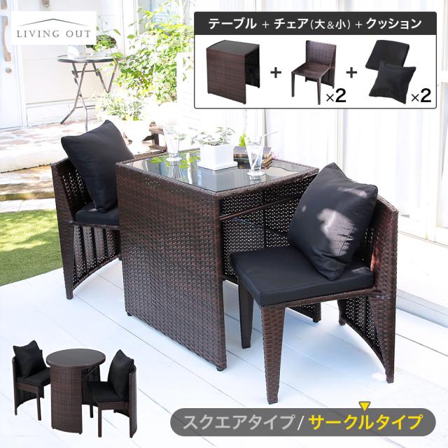 テーブル、チェア大、チェア小 各1個 / 座面クッション、背中クッション 各2個