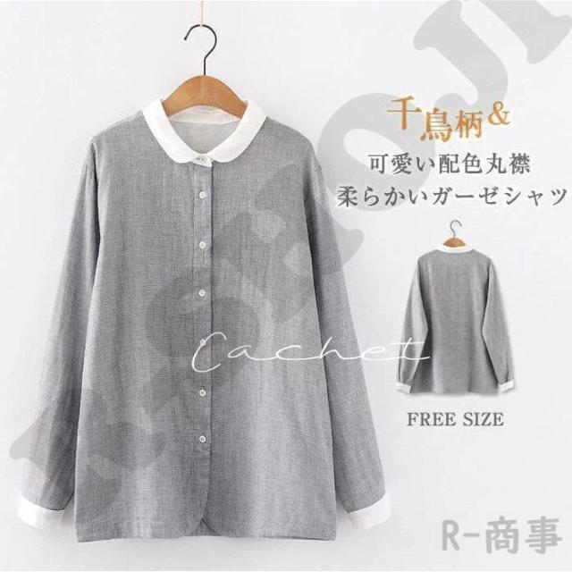 コットン100% シャツブラウス レディース 丸襟 シャツ ブラウス 長袖 ス 羽織り ガーゼ カジュアル 千鳥柄 2重ガーゼ 大きいサイズ 体型カバー はおり 通勤 秋 夏 冬 春 シンプル 着回し ガーゼコットン 柔らかい 可愛い 30代 20代 40代