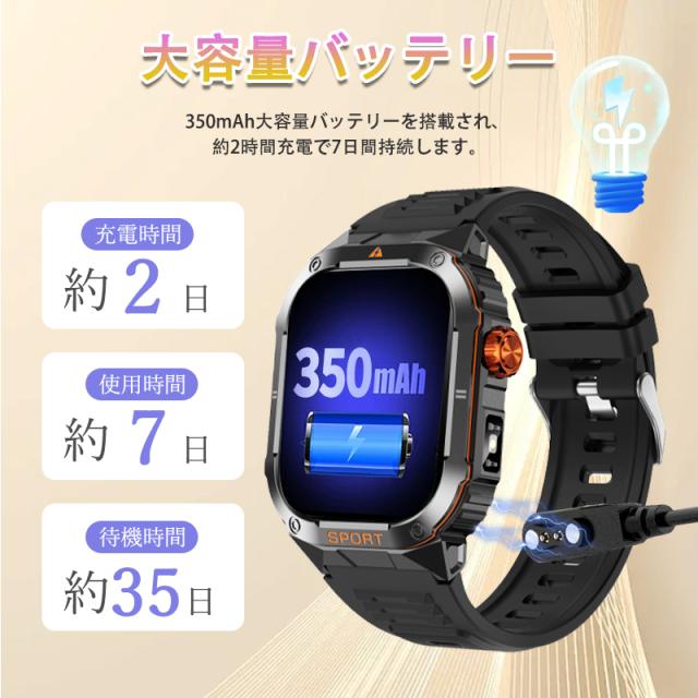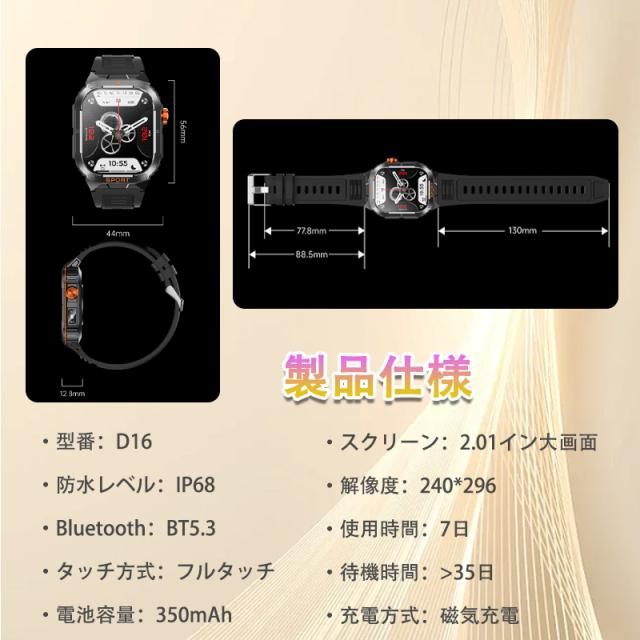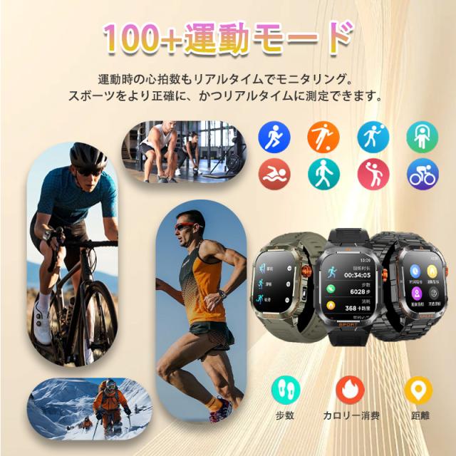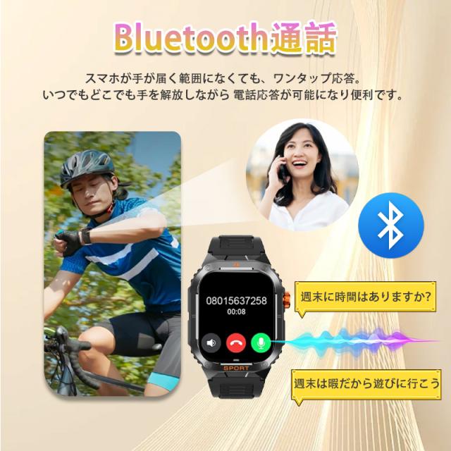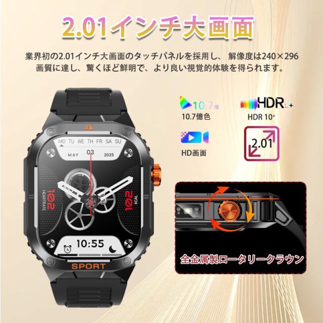 【Bluetooth5.3通話&メッセージ通知機能&音声アシスタント】本スマートウォッチはスピーカー&高性能マイクを内蔵され、携帯電話を出さなくても、スマートウォッチでの通話を実現しました。スマホと接続された後に、着信の応答と拒否/電話をかけることなどができます。通話履歴も表示され、通話記録を保存することもできます。両手を解放し、生活、仕事の効率を更に上げます。 また、着信、SMS、LINE、Twitter、Facebook、Instagram、Whatsapp、skype、Viber、Linkedinなどのメッセージ通知と着信通知をサポートします。スマートフォンを出さなくてもすべての内容を確認できます。メッセージの削除もできます。 最新の音声アシスタントも搭載され、腕時計にアシスタント機能を起動して話すだけでスマホの音声アシスタント機能を起動します。【IP68防塵防水&軍用規格スマートウォッチ】このスマートウォッチは業界最高水準のIP68防塵防水機能を実現、水や汗による故障の心配なく利用できます。本スポーツウォッチは屋外や、粉塵の舞う製造工場で使用することができ、防塵防滴、耐衝撃、耐高温/耐低温性能などの頑丈設計を行い、多くの軍用標準テストに合格することができます。また、高精細で美しい色を表現できる2.01インチタッチディスプレイを搭載し、視認性に優れた高解像度大画面を採用され、画質がより鮮明になり、より高精度な大画面で文字を表示されます。例のない快適な視覚感と優れた操作感をもたらします。※お風呂、サウナ、海水、温泉などのご利用はお控えください。【長持ちバッテリー&文字盤カスタマイズ可能】本スマートウォッチは 大容量バッテリーを内蔵し、頻繁に充電する必要がなく、旅行や出張先でのバッテリー切れの心配も不要です。一回のフル充電で7-15日使用でき、電池切れのストレスから解消!(個人の利用状況と電波強度によって、持続利用可能な時間が異なります)。付属の磁気充電ケーブルをスマートウォッチの充電端子に接続すると充電開始となります。また、スマートウォッチ本体の文字盤を搭載する以外、専用アプリで300種類以上の文字盤をダウンロードできるし、お好きの写真も設定可能、家族や恋人、アイドルなどの写真を文字盤の画面に変えることもできます。【100種類運動モード&運動記録】このスマートウォッチはランニング、ウオーキング、サイクリングなど約100種類のスポーツモードが搭載され、アプリと接続すれば、運動距離、時間などデータを記録できます。。GPS運動対応、アプリで運動の軌跡も直接見ることができます。歩数と消費カロリーを測定し、日常生活やワークアウト中の消費カロリーをチェックして、目標達成に向けた計画づくりに役に立ちます。(スマートウォッチ本体はGPS内蔵されておりません、スマホのGPSを使用されております。)【音楽制御&カメラ遠隔操作&色んな機能】スマホと接続すれば、音楽のアプリを呼び出しできて、スマホを出さなくても音楽(音楽再生、一時停止、次の曲、前の曲)をコントロールできます。また、スマートウォッチを手首につけたまま、カメラ制御の画面をタッチ/揺らせばスマホのカメラを遠隔操作してシャッターを切れます。自撮りなどシャッターを押しにくい場合にすごく便利です。そのほかに天気予報、輝度調整、ストップウォッチ、アラーム、スマホを探す、など様々な便利機能を搭載されております。