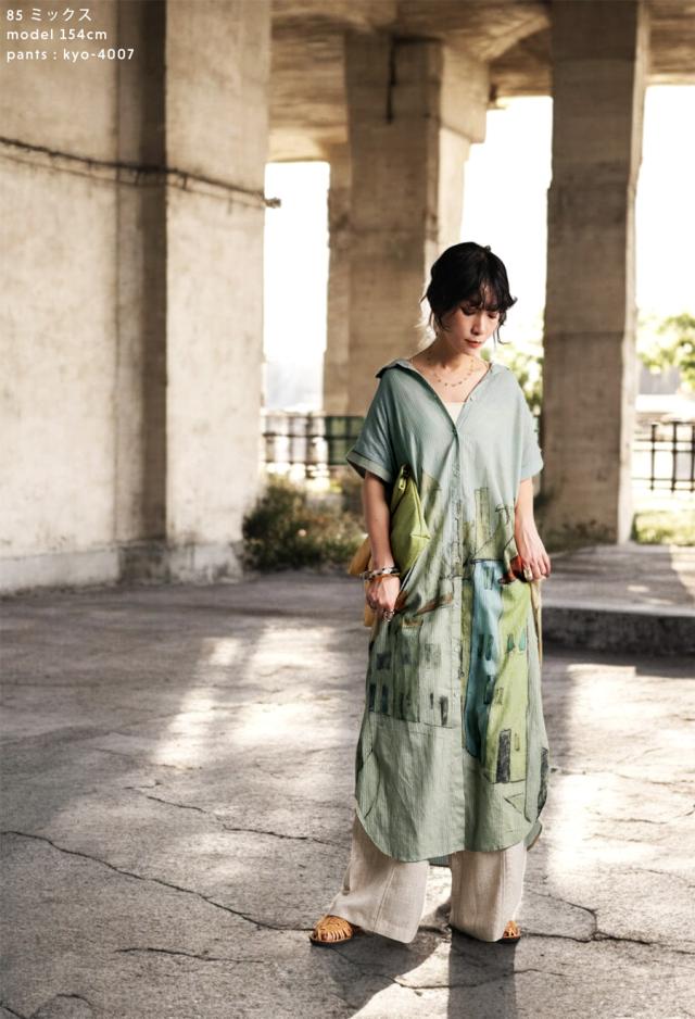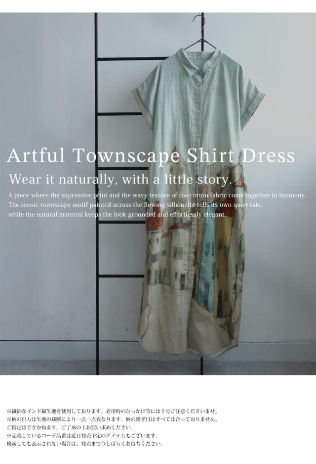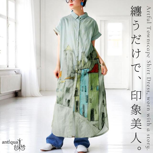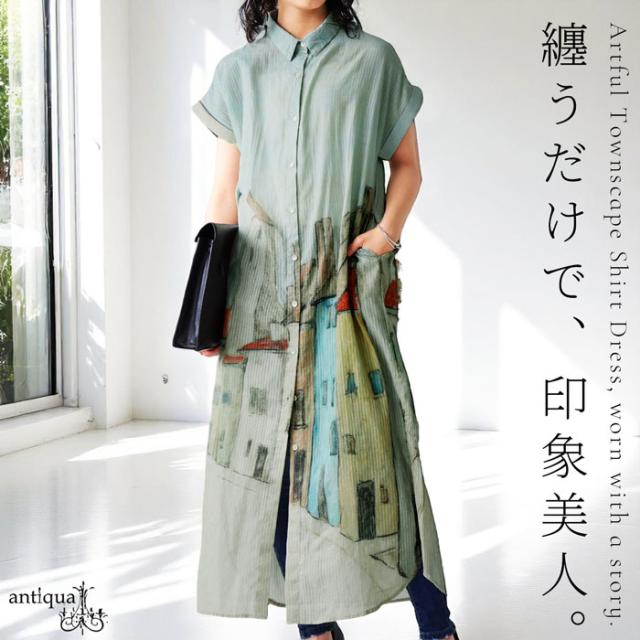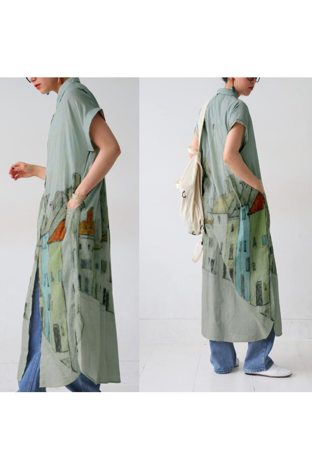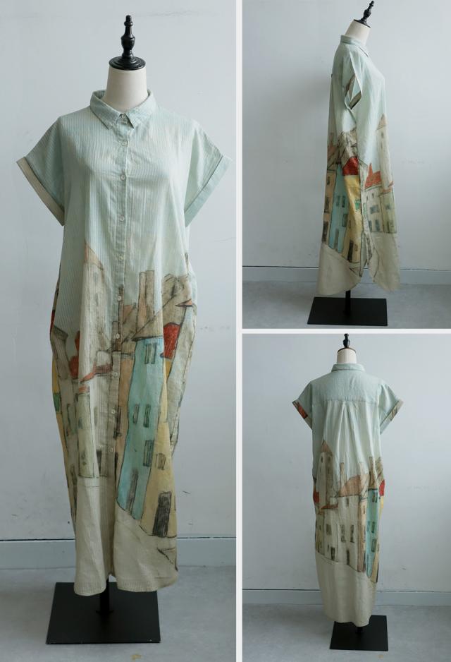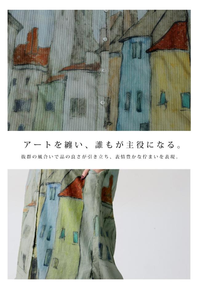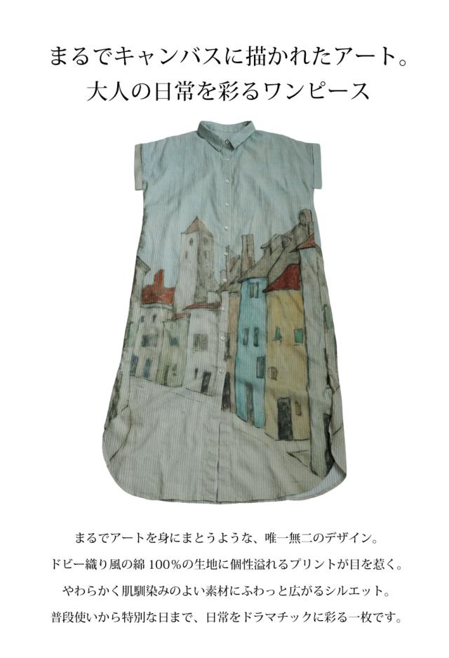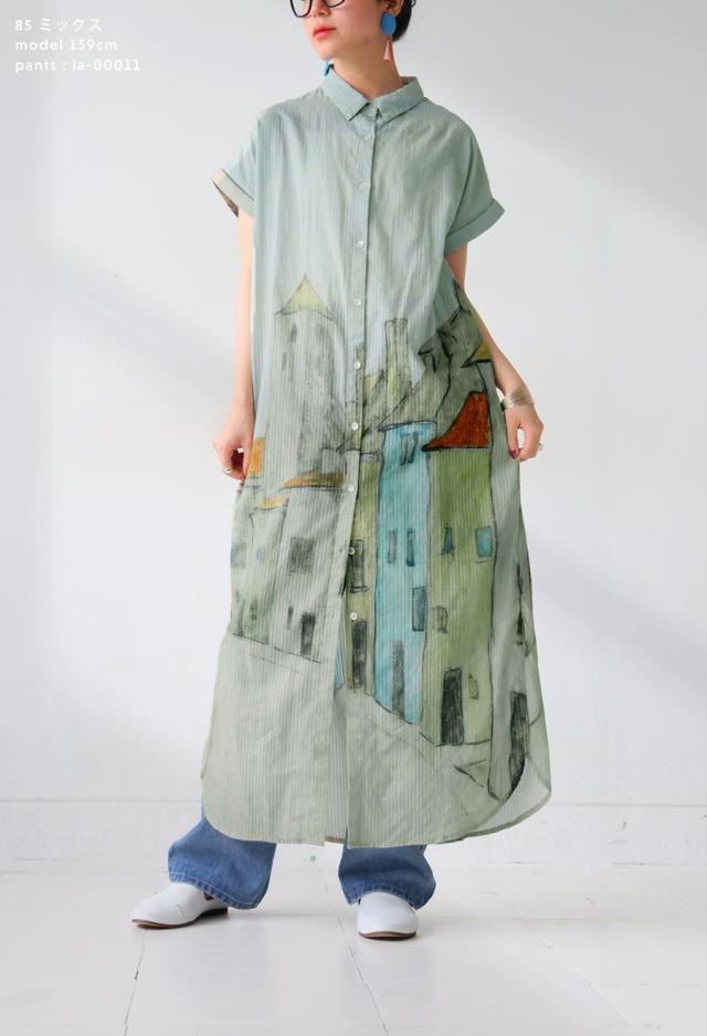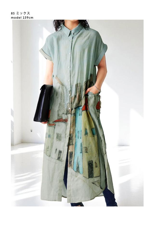 iya-00109 シャツワンピース ワンピース ロング シャツ アート柄 綿100 綿 コットン 街並み風景 ドビー織風 シェルボタン ポケット付き 夏 羽織り レギュラーカラー