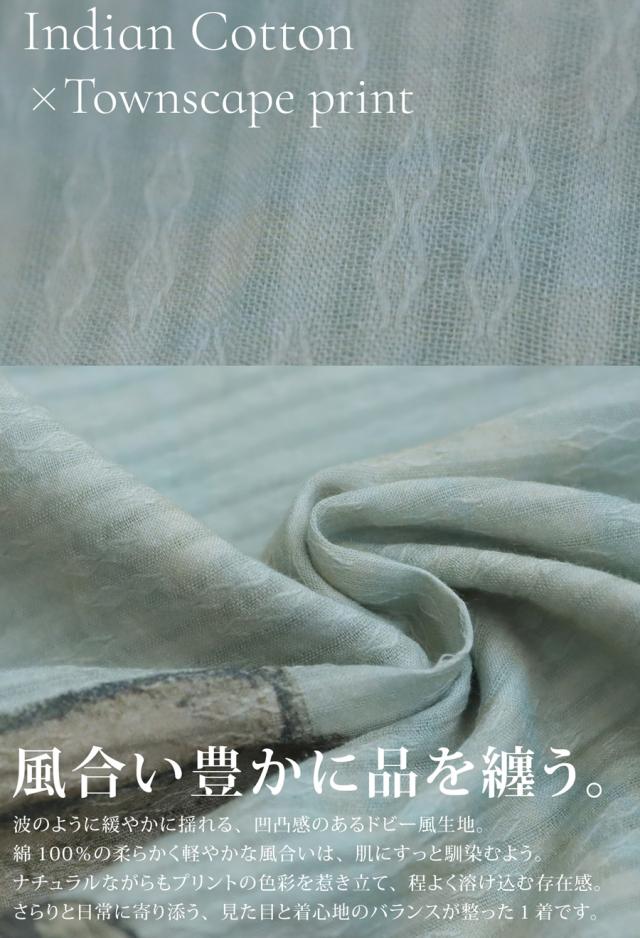 街並みを描いたアートプリントが目を惹く主役級の一着で、シンプルなコーディネートもたちまち印象的に仕上がります。