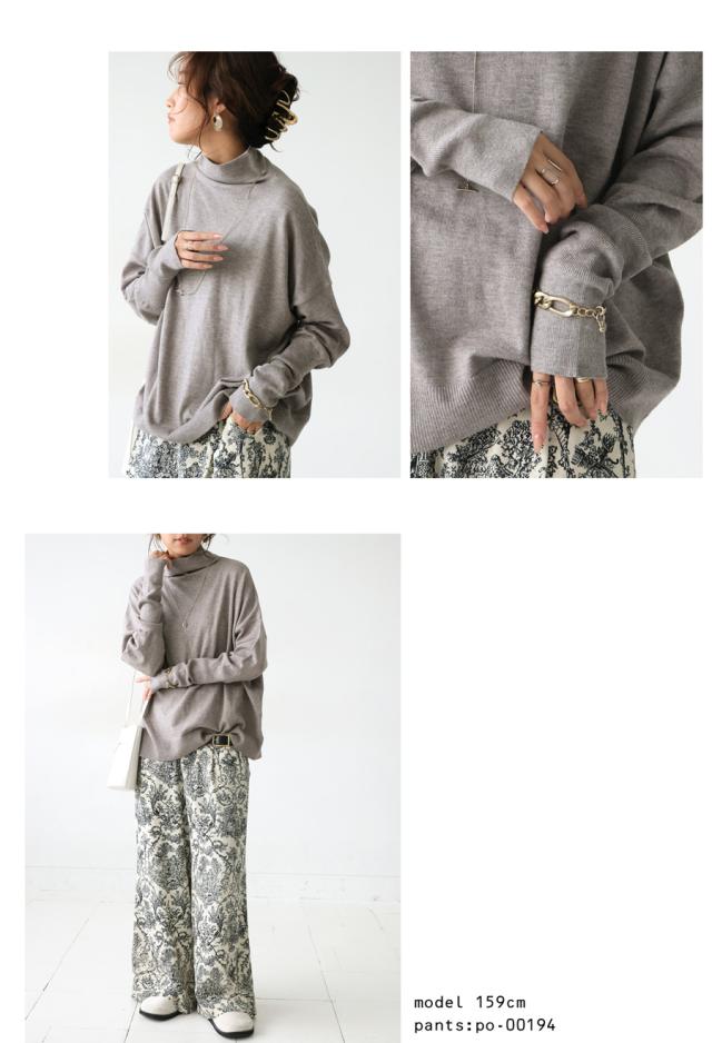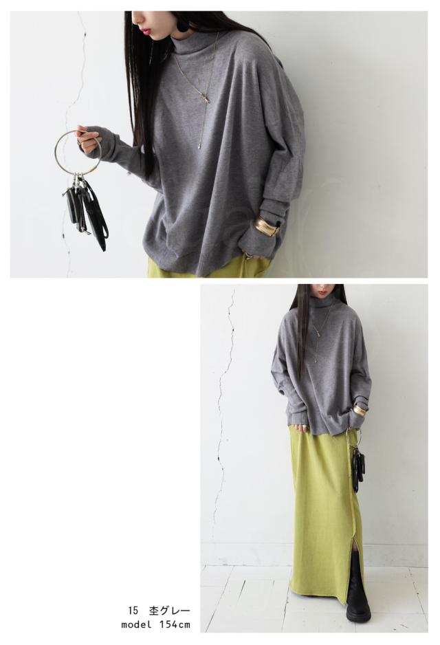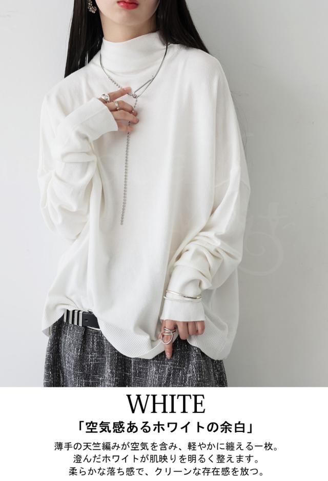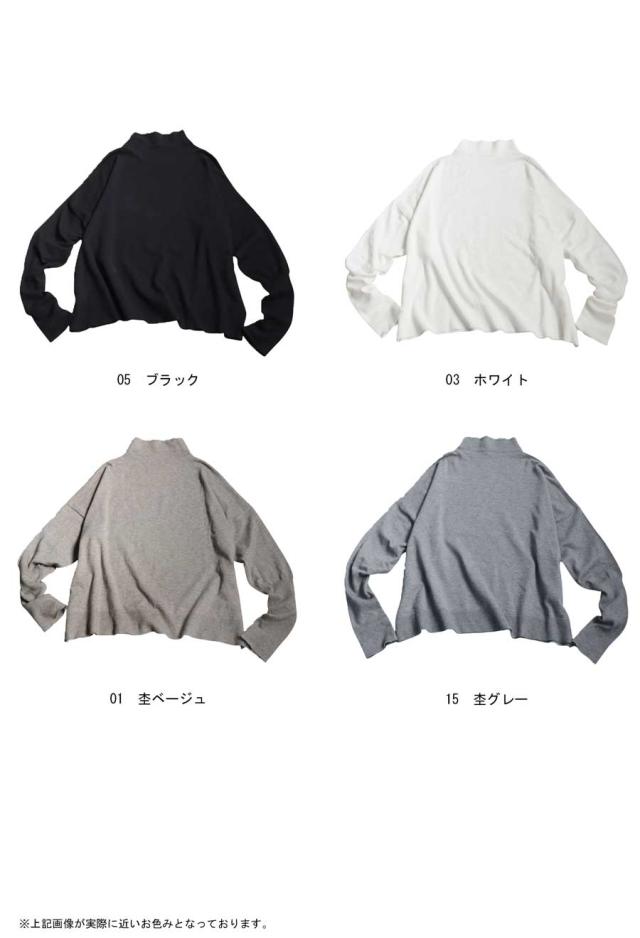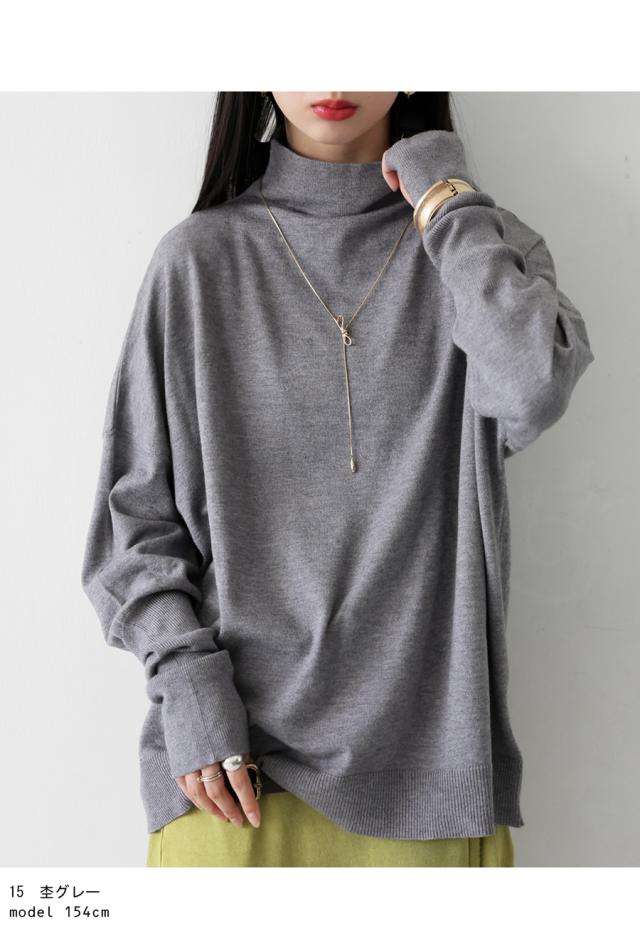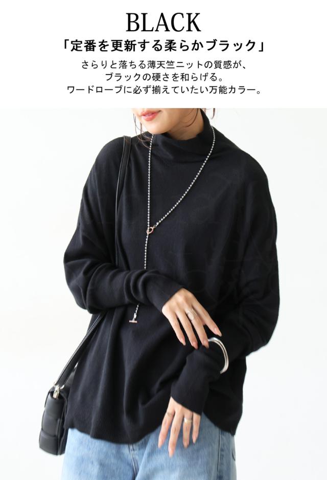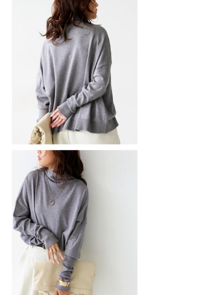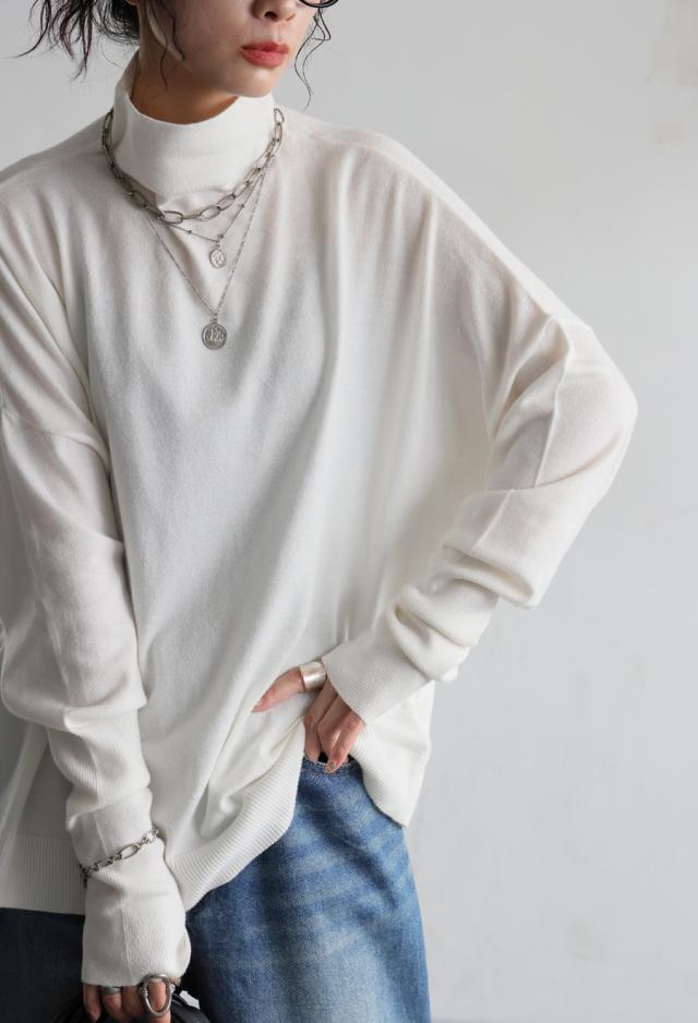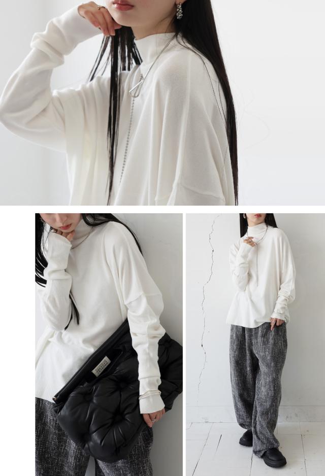 薄手のハイゲージ天竺編みで仕立てた、とろみ生地のハイネックニットが登場。