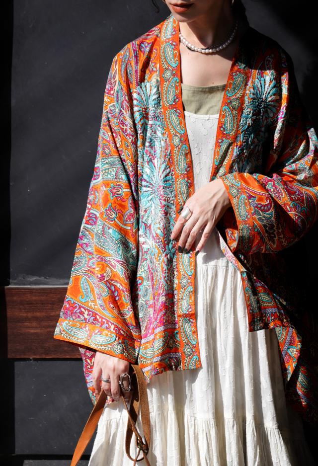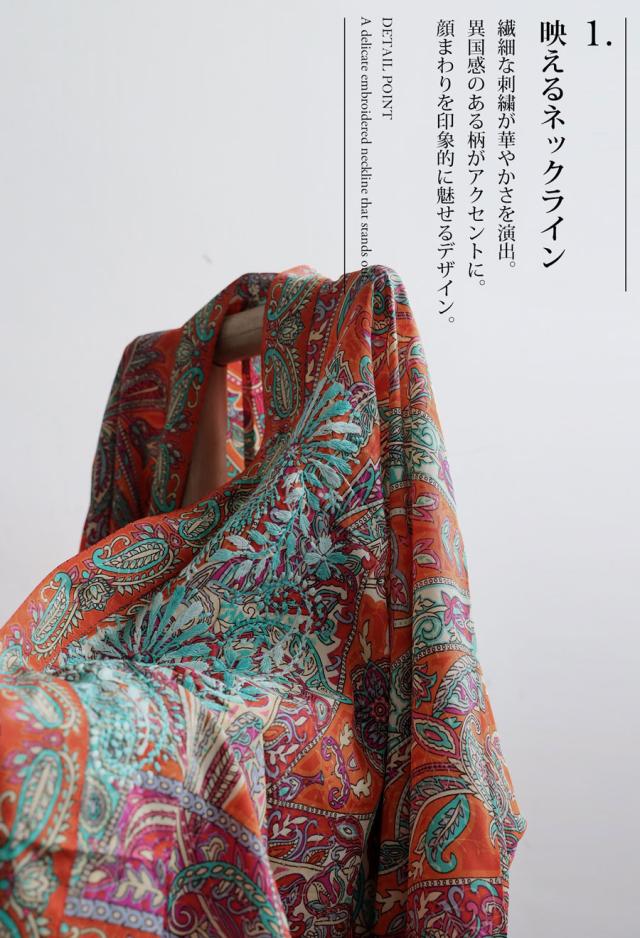 オレンジをベースに、ブルーやパープルの色糸であしらった刺繍が目を惹きます。