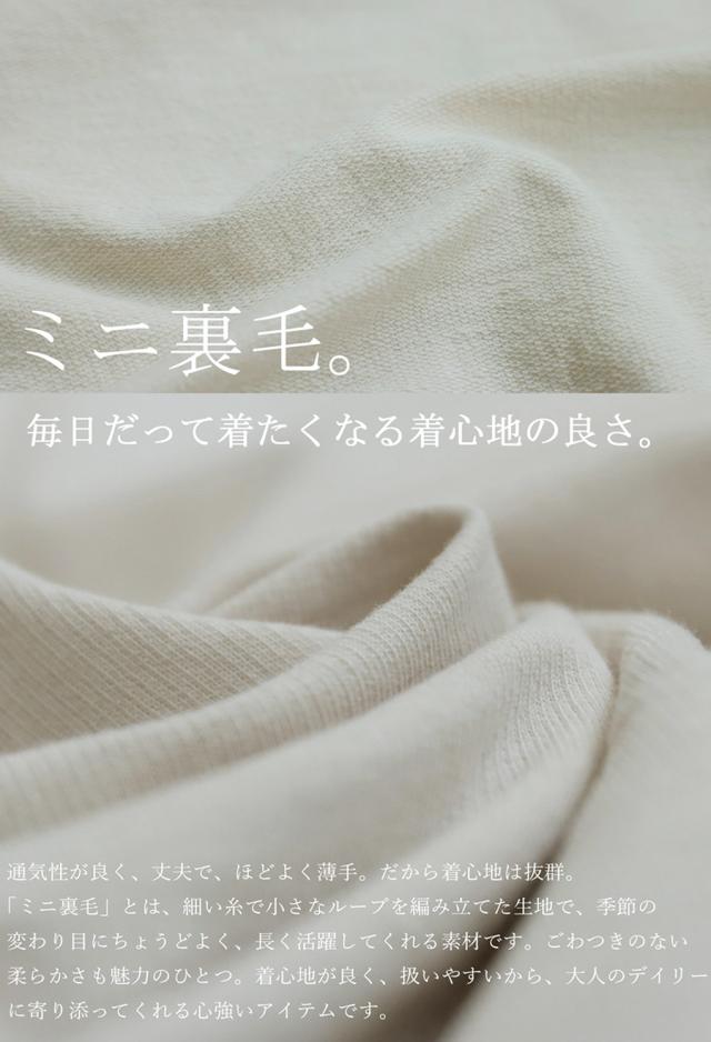 肌ざわりのよい綿100%のミニ裏毛素材は、薄手ながらもしっかりとした生地感で、通気性にも優れています。