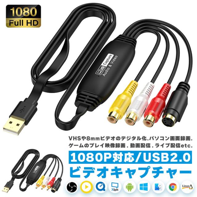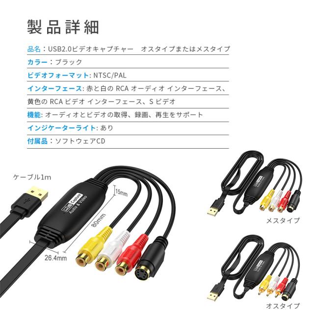ビデオキャプチャ USB2.0接続 選べる オス メス キャプチャーボード ビデオキャプチャー S端子 コンポジット端子 キャプチャーケーブル ビデオ DVD VHS ゲーム機 カメラ パソコン取り込み デジタル化 PC mac windows