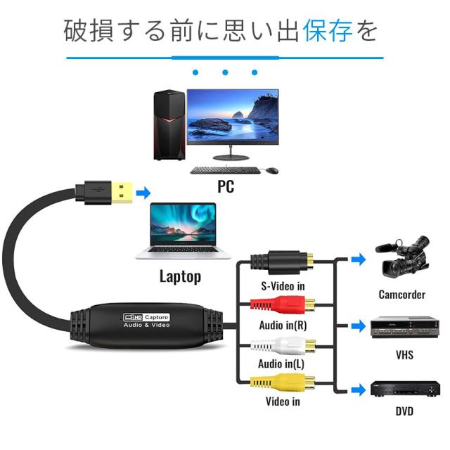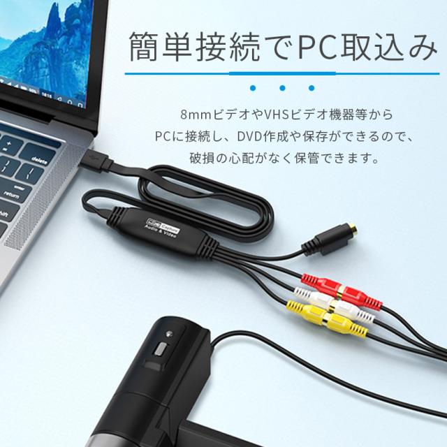 【VHS・8mmビデオ等をDVDに】昔録りためたVHSのテープや、古い8mmビデオテープを、PCに取り込んでデータ化してDVDに簡単に保存することができます。簡単な編集もでき、編集したデータをオリジナルDVDにできます。【簡単操作でビデオ映像をデジタル保存】映像編集ソフトはいりません。挿してそのまま使えます。ビデオデッキやゲーム機などに接続して、映像をデジタル保存できます。簡単にデータを保存できるうえ、ビデオテープのように劣化することがないので長期保存できます。