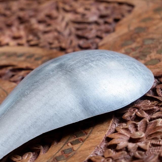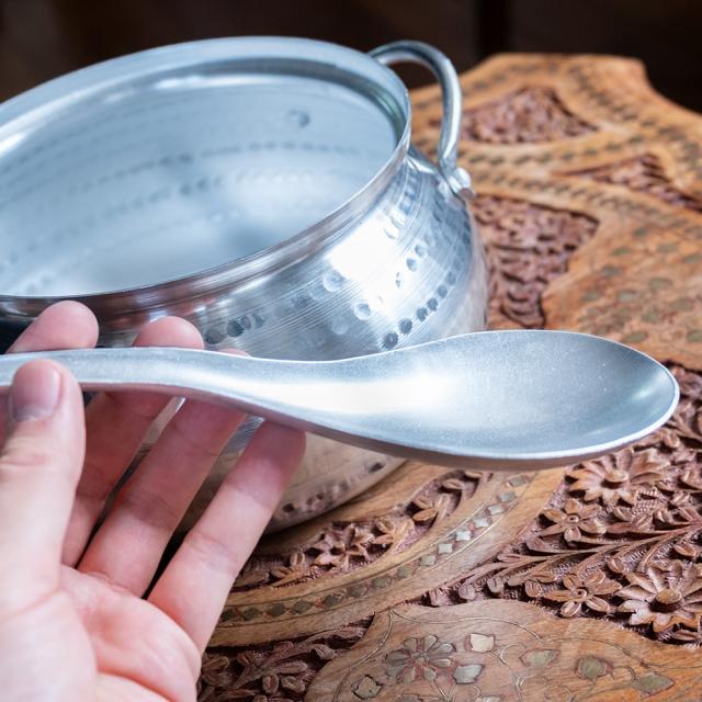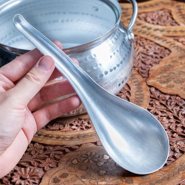こちらの大きなレンゲは、ベトナムの台所や食堂で今も使われているような、昔ながらのレンゲです。実用面を重視して無駄な装飾や艶はありませんが、滑らかな機能美のあるフォルム、味わいや存在感があります。素材は軽くて丈夫なアルミニウム。手に取ると想像よりも軽く、それでいて力を入れても曲がらずしっかりと厚みもあり、頼れる質感です。全長約22.5cm、幅約7.5cm。深さもあるので汁ものをすくうのにも向いており、単なるレンゲというより、深さのあるサービングスプーンや、手軽な片手おたまのような存在です。