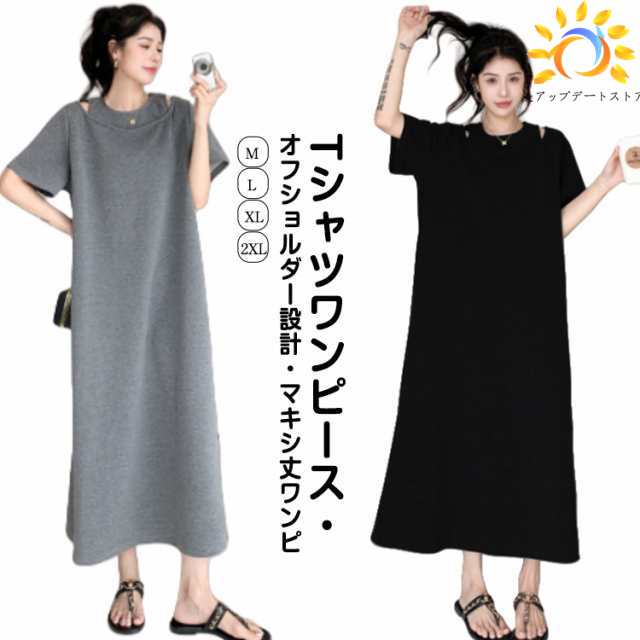 ワンピース Tシャツワンピース レディース 夏 無地 オフショルダー マキシ丈ワンピース ロングワンピース 夏用 ゆったり カジュアルワンピース サマーワンピース Hライン 着?せ 大きいサイズ グレー ブラック M L XL 2XL 送料無料