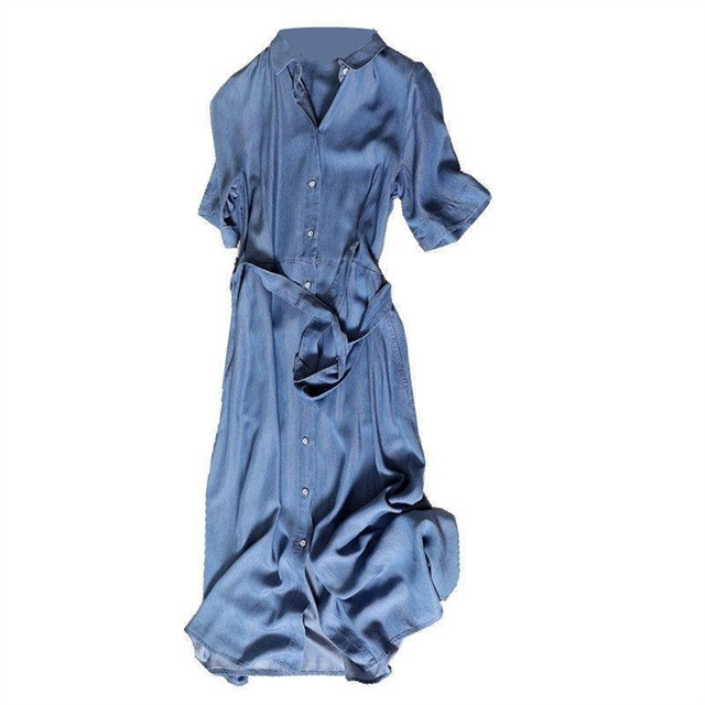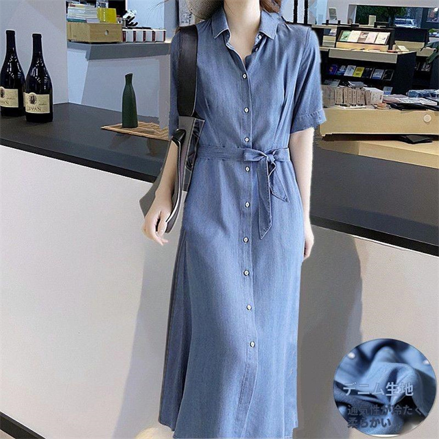 半袖ワンピース 春 夏 デニムワンピース 冷感デニム ロングワンピース シャツワンピース ロング丈 膝下丈 テンセル デニム ワンピ 薄手 ウエストベルト新作