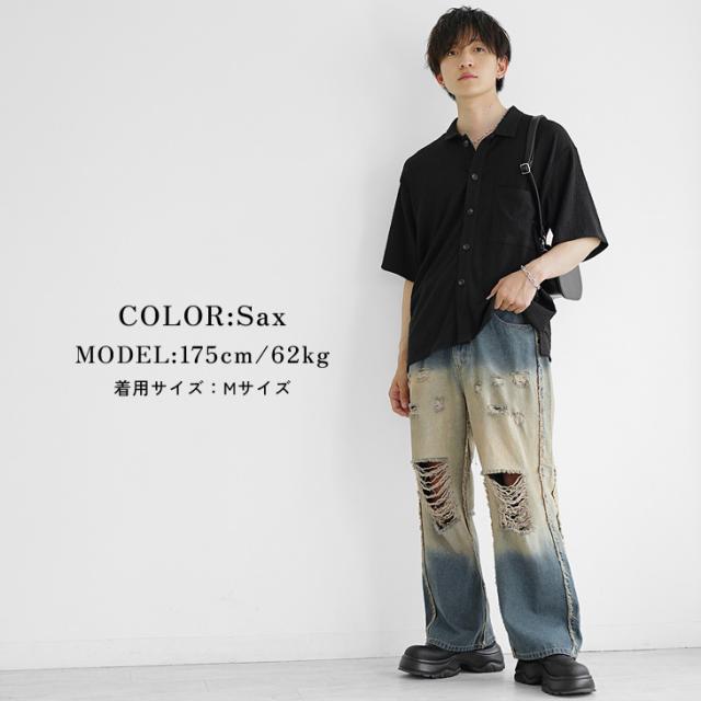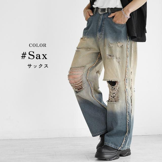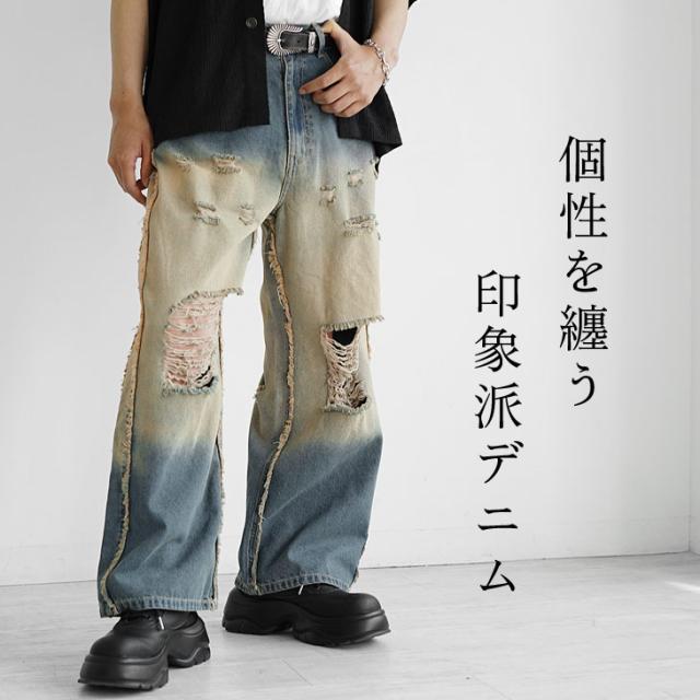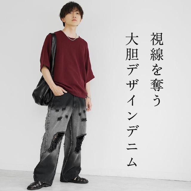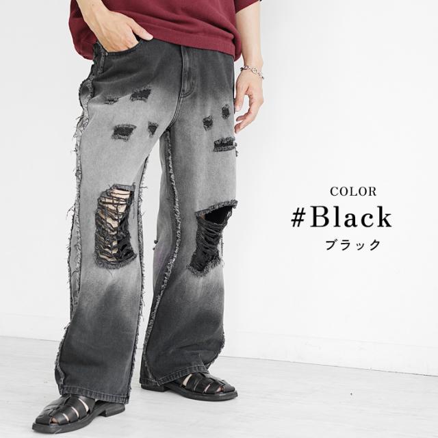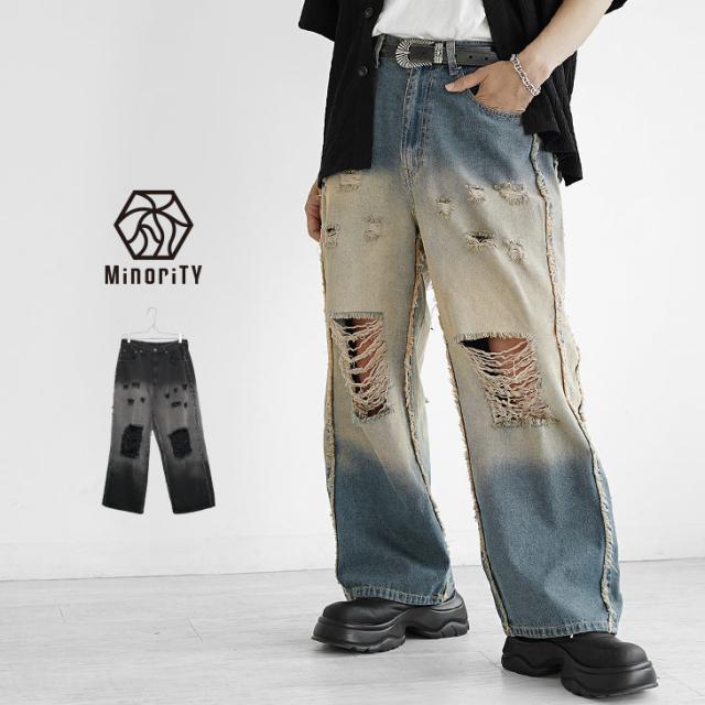 ダメージ デニム ワイドデニム メンズ ワイドパンツ デニム メンズ ジーパン メンズ ジーンズ デニムワイドパンツ Gパン ダメージ 太め 黒 ブラック ブルー ブリーチ オーバーダイ ウォッシュ 春 春服 春夏 メンズファッション マイノリティ