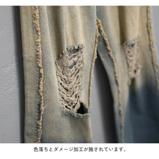 膝や太ももに施された大胆なダメージ加工とグラデーションのデザインが目を惹くバギーデニム。サイドのフリンジデザインが、無骨さの中に抜け感を演出しコーデの主役に。膝周りのグラデーションも美しく、こだわりが光るアイテムです。●FABRIC(素材)「柔らかデニムで軽快に」