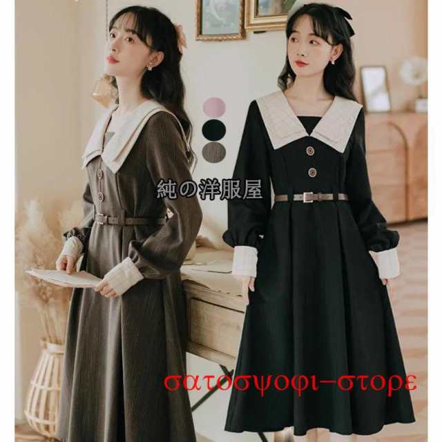 レトロ ワンピース 長袖 春ワンピース ミモレ丈 森ガール系 ロング ワンピース チェックチェルシー?カラーセーラーワンピース 学生服 ベルト有り フレア 美シル