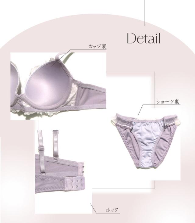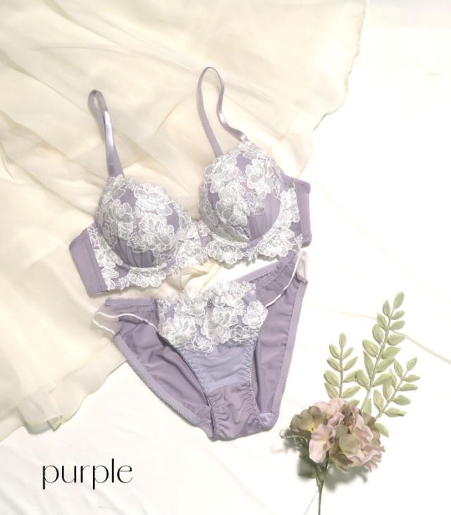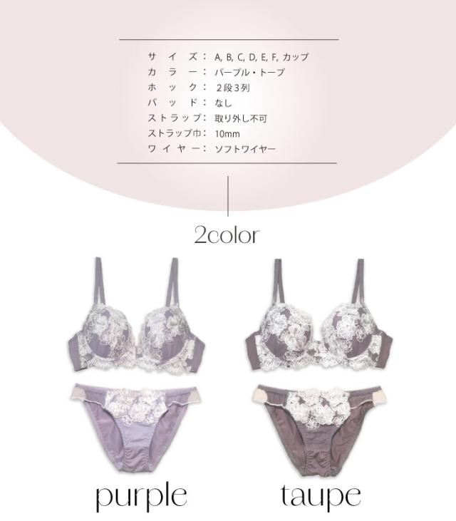 オーロララメの刺繍レースが、落ち着きのあるデザインの中に、フェミニンな印象をプラス。やわらかなソフトワイヤー仕様で心地よい付け心地◎ショーツ脇にはチュールネットをあしらった、シアーなデザインに仕上がっています。優しい印象の「パープル」と、上品な印象の「トープ」の2色展開。年齢を選ばないデザインなのも嬉しいポイント。