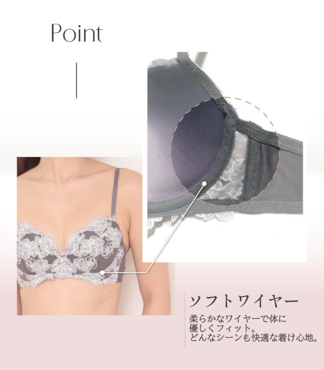 オーロララメの刺繍レースが、落ち着きのあるデザインの中に、フェミニンな印象をプラス。やわらかなソフトワイヤー仕様で心地よい付け心地◎ショーツ脇にはチュールネットをあしらった、シアーなデザインに仕上がっています。優しい印象の「パープル」と、上品な印象の「トープ」の2色展開。年齢を選ばないデザインなのも嬉しいポイント。