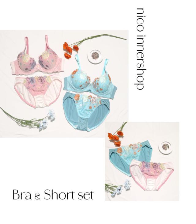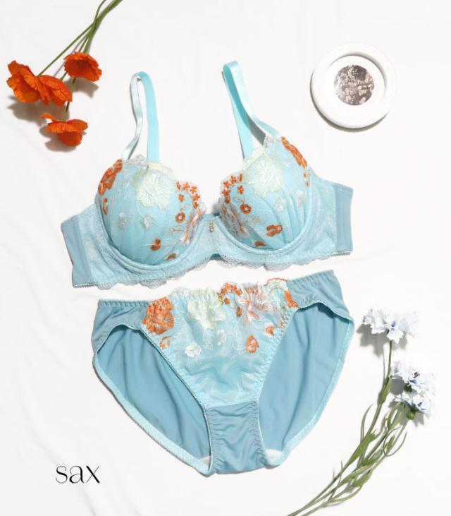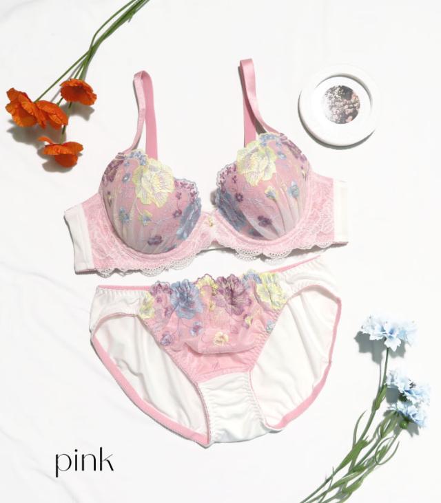 3色のフラワー刺繍が胸元を彩る華やかでガーリーなブラセット。大小さまざまな花が咲き誇り着ているだけで気持ちも華やかになる美しいランジェリー。カップ下にはレースをあしらい可憐な印象をプラス。スタンダードなスタイルでデイリー使いにぴったり。乙女チックで王道可愛いピンクとビビットなカラーリングが目を惹くサックスの2色展開です。可愛いを身にまとうのにぴったりな一着となっています。