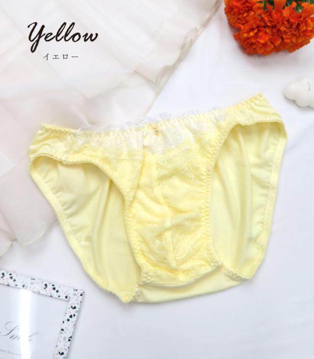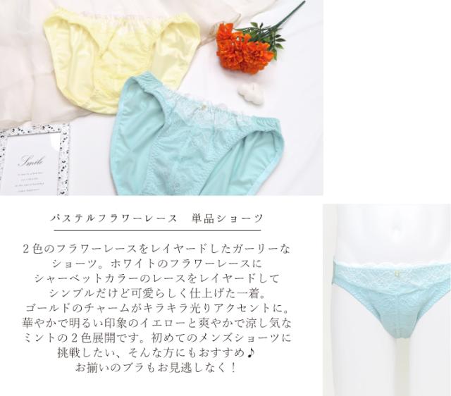 2色のフラワーレースをレイヤードしたガーリーなショーツ。ホワイトのフラワーレースにシャーベットカラーのレースをレイヤードしてシンプルだけど可愛らしく仕上げた一着。ゴールドのチャームがキラキラ光りアクセントに。華やかで明るい印象のイエローと爽やかで涼し気なミントの2色展開です。初めてのメンズショーツに挑戦したい、そんな方にもおすすめ♪お揃いのブラもお見逃しなく!
