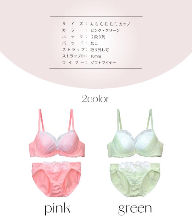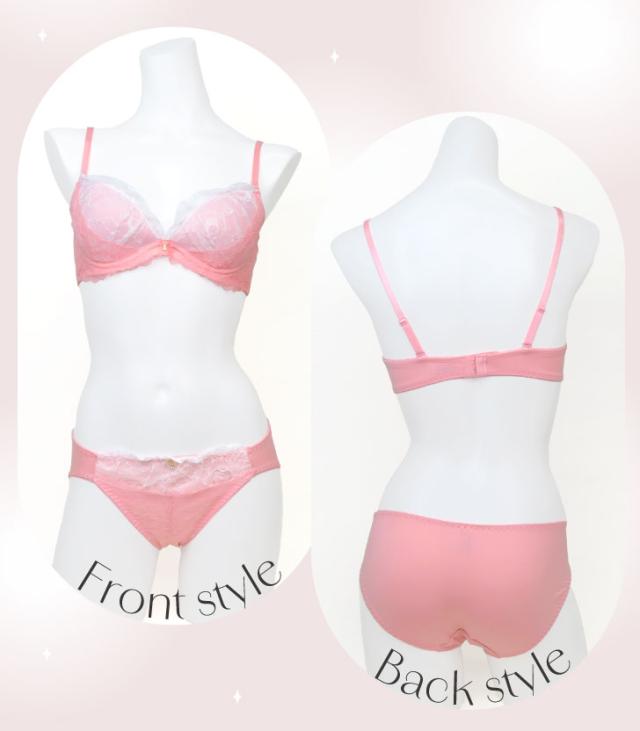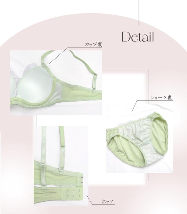 レースをたっぷりあしらったガーリーで乙女心をくすぐるブラセット。カップ上部にふんわりとホワイトのレースフリルを施し、さらにアーチ柄レースをレイヤードして繊細な可愛らしさを印象付ける一着に仕上げました。センターにはゴールドのチャームをあしらいドレスのような華やかさをさらに引き立てます。やわらかいソフトワイヤー仕様なので体にやさしくフィットして痛くなりにくい◎ショーツはノーマルタイプでデイリー使いにぴったり。正統派可愛いピンクとパステルカラーで爽やか可愛いグリーンの2色展開です。