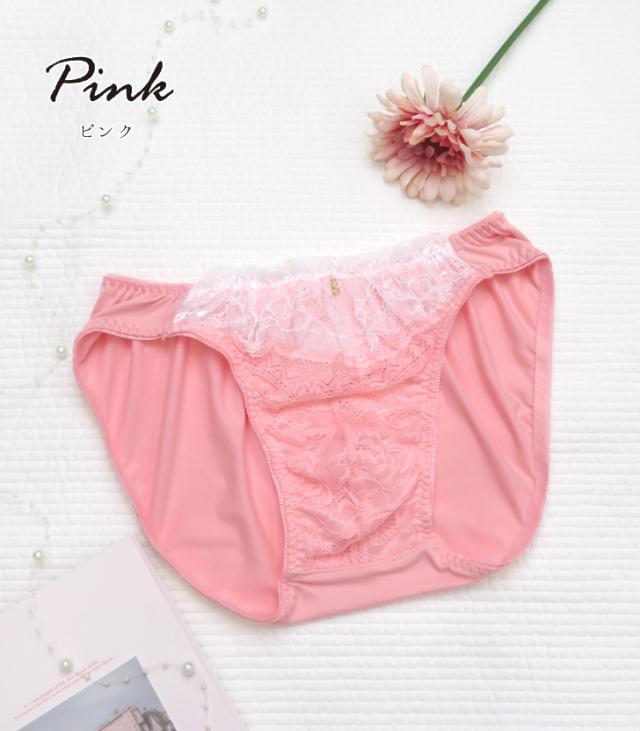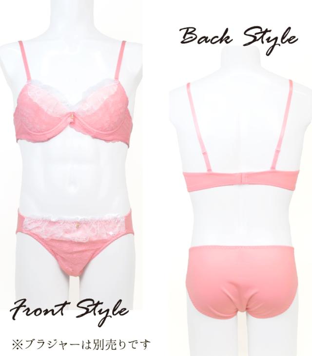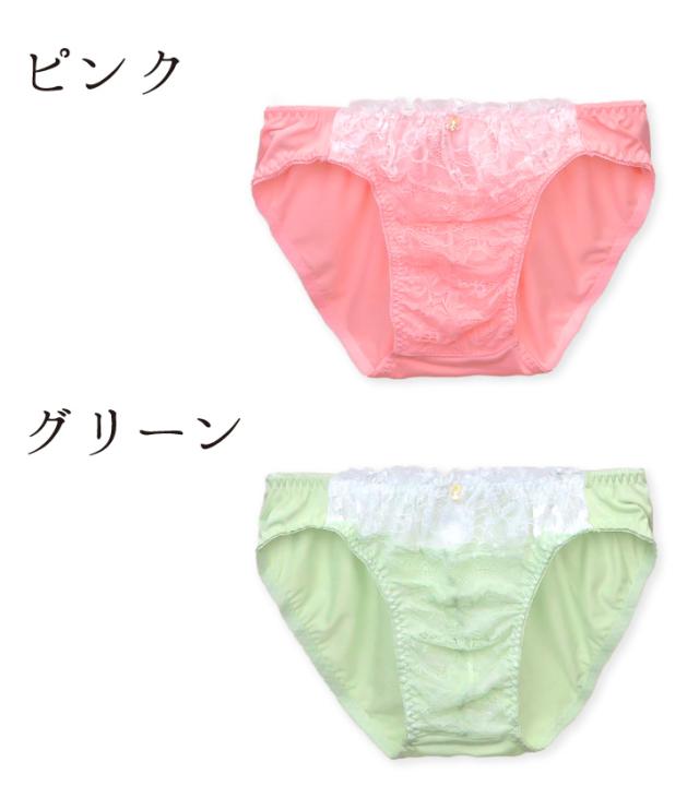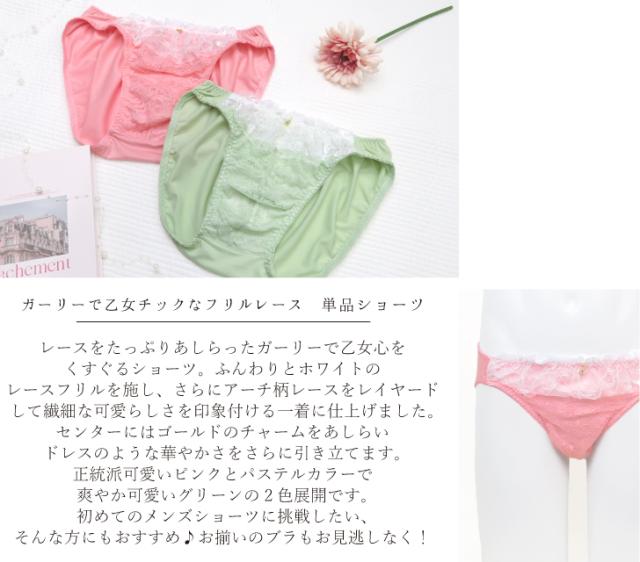 レースをたっぷりあしらったガーリーで乙女心をくすぐるショーツ。ふんわりとホワイトのレースフリルを施し、さらにアーチ柄レースをレイヤードして繊細な可愛らしさを印象付ける一着に仕上げました。センターにはゴールドのチャームをあしらいドレスのような華やかさをさらに引き立てます。正統派可愛いピンクとパステルカラーで爽やか可愛いグリーンの2色展開です。初めてのメンズショーツに挑戦したい、そんな方にもおすすめ♪お揃いのブラもお見逃しなく!