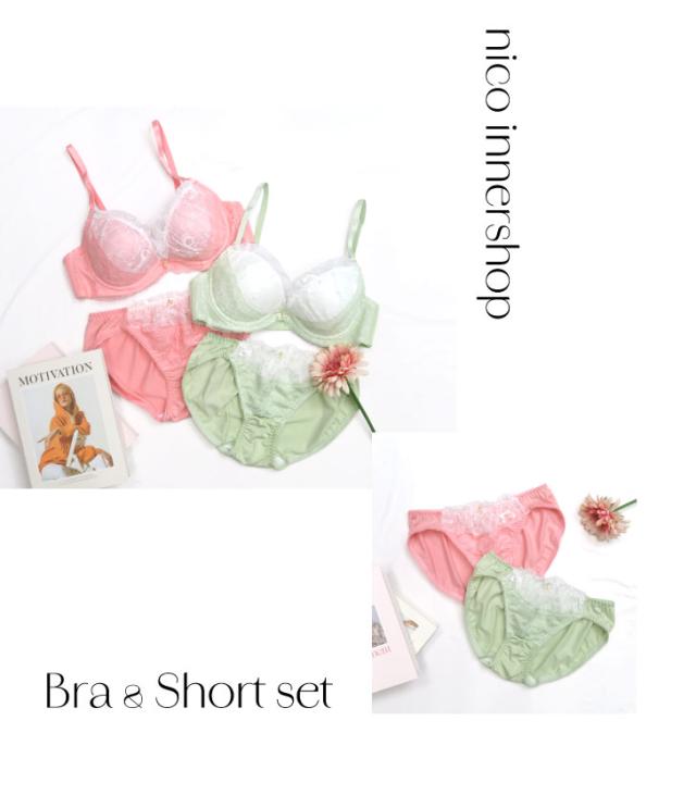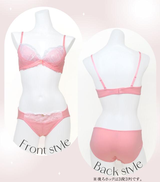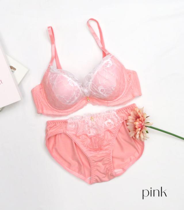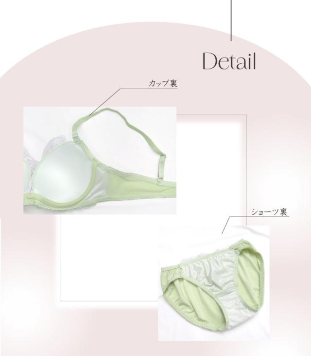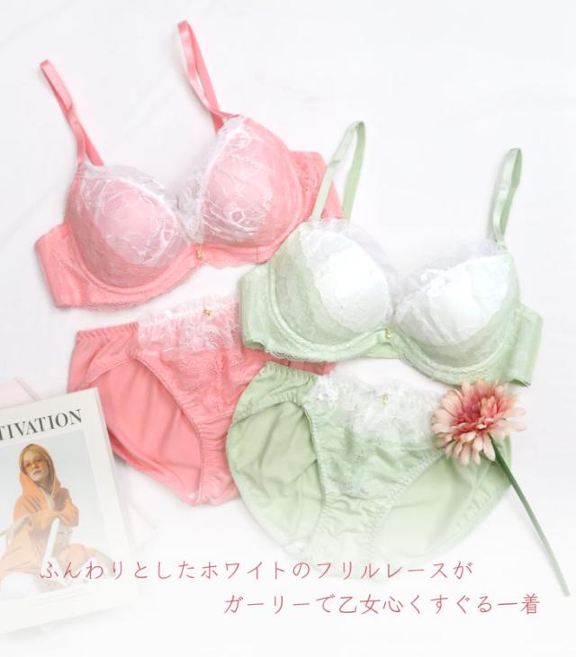 レースをたっぷりあしらったガーリーで乙女心をくすぐるブラセット。カップ上部にふんわりとホワイトのレースフリルを施し、さらにアーチ柄レースをレイヤードして繊細な可愛らしさを印象付ける一着に仕上げました。センターにはゴールドのチャームをあしらいドレスのような華やかさをさらに引き立てます。やわらかいソフトワイヤー仕様なので体にやさしくフィットして痛くなりにくい◎ショーツはノーマルタイプでデイリー使いにぴったり。正統派可愛いピンクとパステルカラーで爽やか可愛いグリーンの2色展開です。