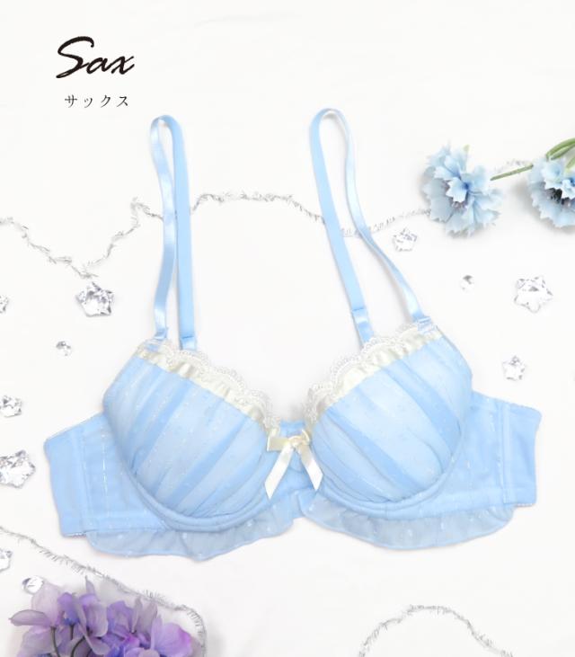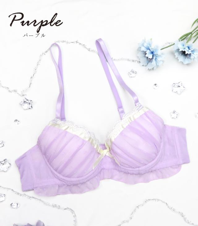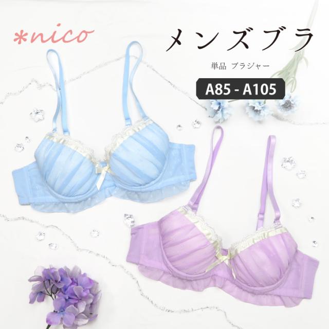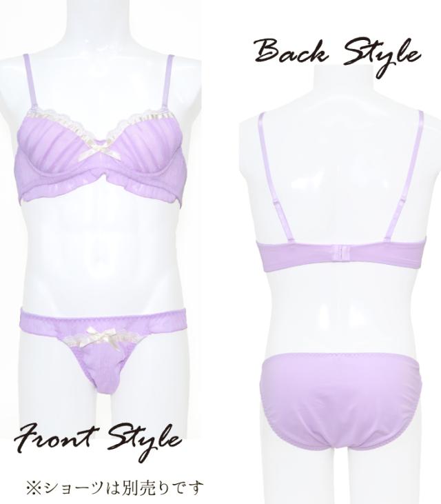 ロマンチックなドット柄ジョーゼット生地にきらめくラメストライプ。たっぷりギャザーとアンダーにはフリルをあしらった乙女チックな一着。さらにサテンリボンとフラワーアーチモチーフを飾り可愛いが詰め込まれたメンズブラジャーに仕上げました。パステルカラーで隙がない可愛さ。パープルとサックスの2色展開です。初めてのメンズブラに挑戦したい、そんな方にもおすすめ♪カップの丸みが分かりにくく、ストラップも長めの設計で体にフィットします。お揃いのショーツもお見逃しなく!