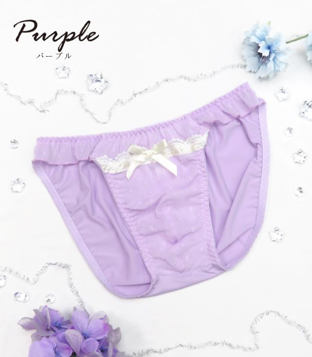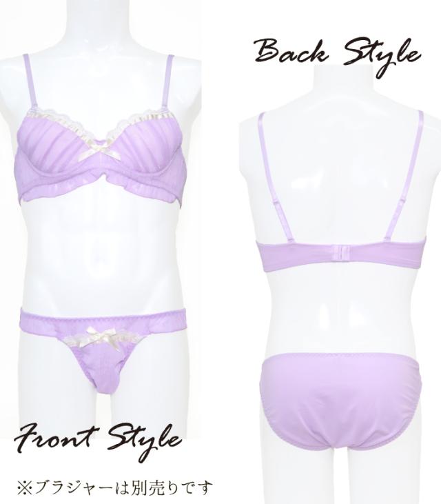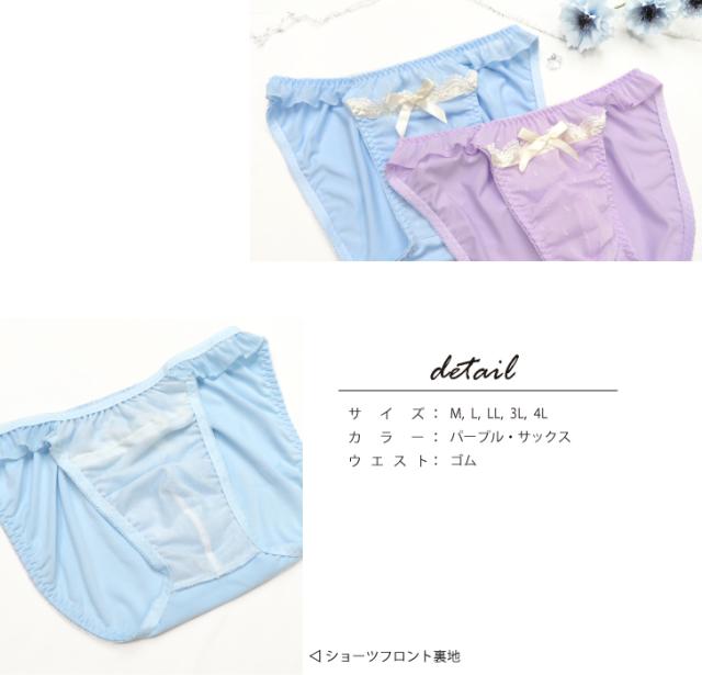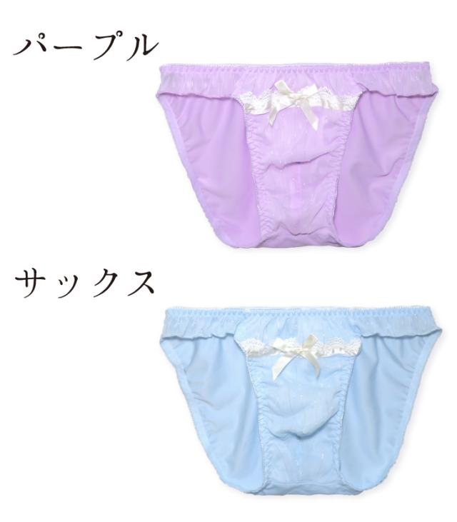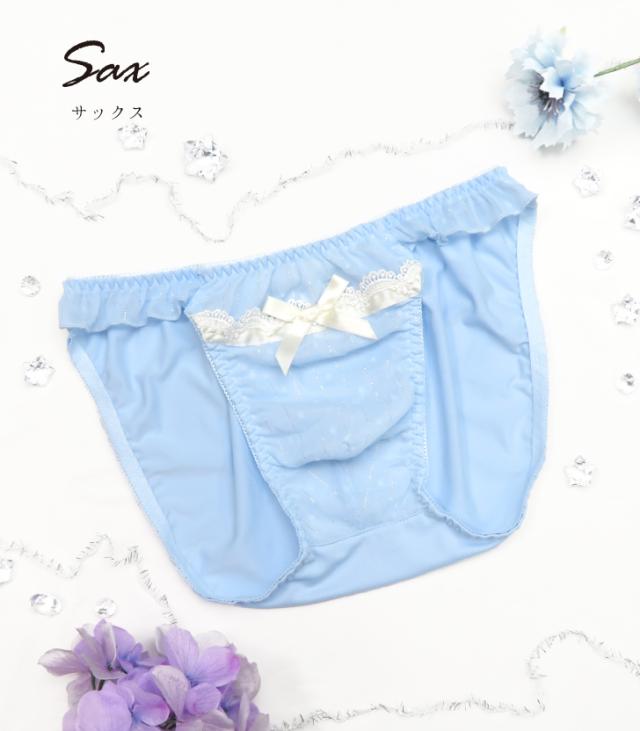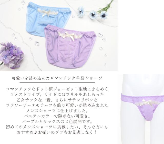 ロマンチックなドット柄ジョーゼット生地にきらめくラメストライプ。サイドにはフリルをあしらった乙女チックな一着。さらにサテンリボンとフラワーアーチモチーフを飾り可愛いが詰め込まれたメンズショーツに仕上げました。パステルカラーで隙がない可愛さ。パープルとサックスの2色展開です。初めてのメンズショーツに挑戦したい、そんな方にもおすすめ♪お揃いのブラもお見逃しなく!