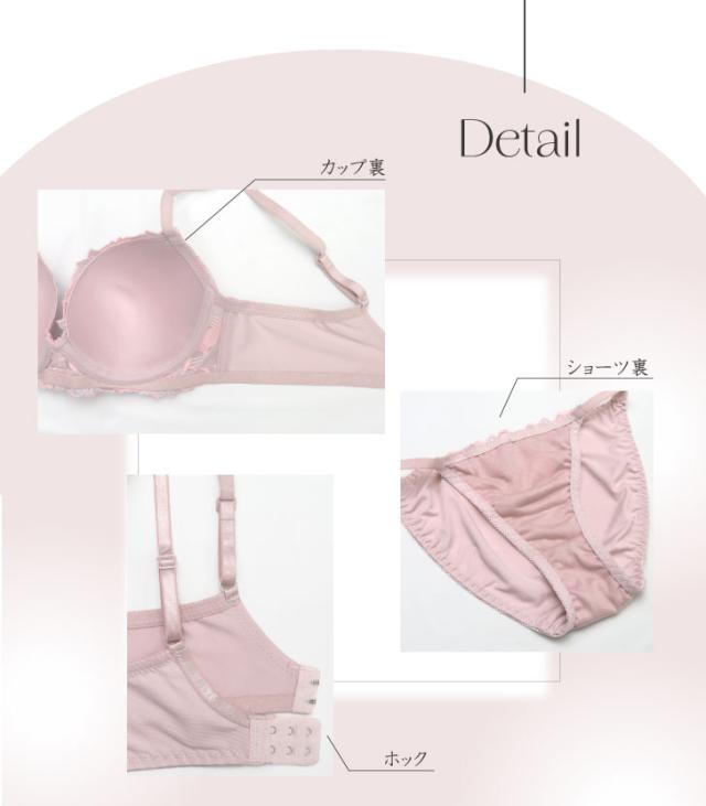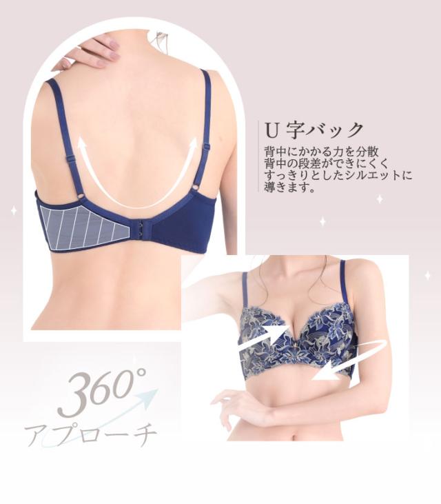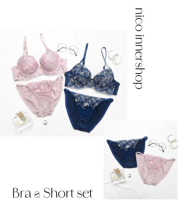 存在感のあるモダンなフラワー刺繍レースが映えるブラセット。切り替えデザインでレースを贅沢にあしらい高級感のある一着に仕上げました。脇高仕様で気になる脇肉をしっかりとキャッチ◎すっきりとしたシルエットを叶えます。ショーツサイドはストラップ使用でセクシーな大人っぽさもプラス。ふんわり華やかな印象のピンクとシルバーの刺繍が映えるブルーの2色展開です。