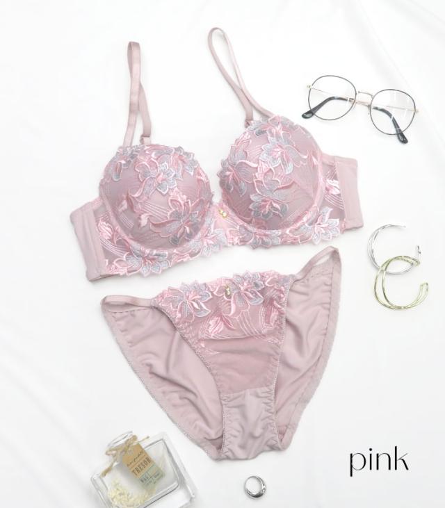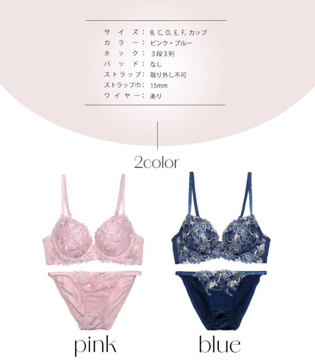 存在感のあるモダンなフラワー刺繍レースが映えるブラセット。切り替えデザインでレースを贅沢にあしらい高級感のある一着に仕上げました。脇高仕様で気になる脇肉をしっかりとキャッチ◎すっきりとしたシルエットを叶えます。ショーツサイドはストラップ使用でセクシーな大人っぽさもプラス。ふんわり華やかな印象のピンクとシルバーの刺繍が映えるブルーの2色展開です。