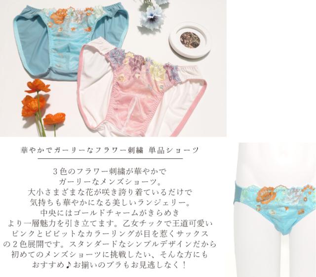 3色のフラワー刺繍が華やかでガーリーなメンズショーツ。大小さまざまな花が咲き誇り着ているだけで気持ちも華やかになる美しいランジェリー。中央にはゴールドチャームがきらめきより一層魅力を引き立てます。乙女チックで王道可愛いピンクとビビットなカラーリングが目を惹くサックスの2色展開です。スタンダードなシンプルデザインだから初めてのメンズショーツに挑戦したい、そんな方にもおすすめ♪お揃いのブラもお見逃しなく!