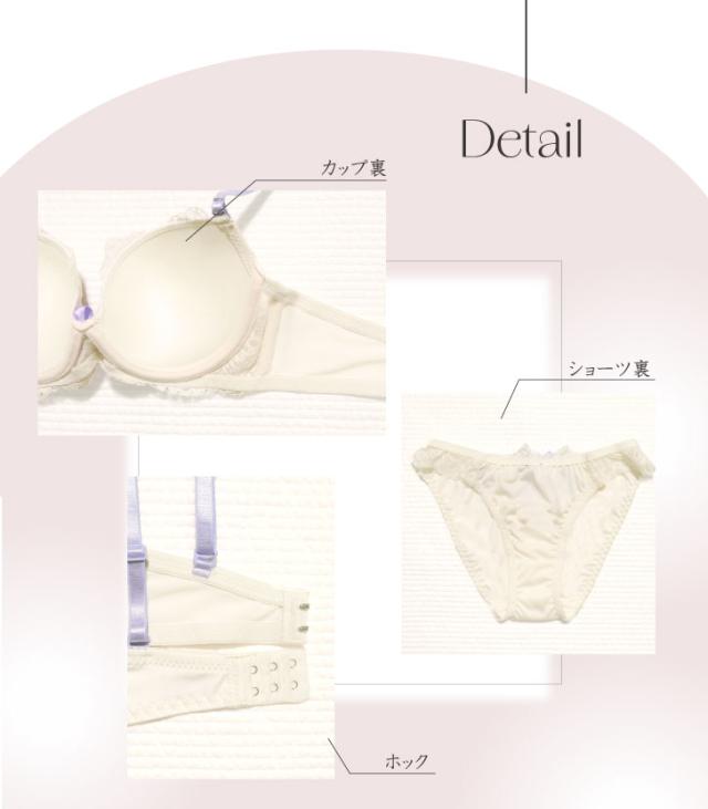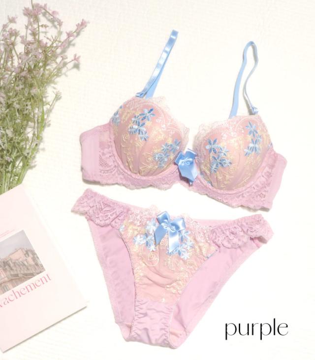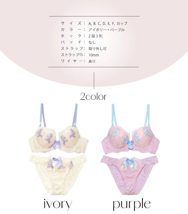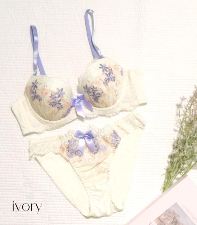 愛らしいフェミニンな印象のフラワーアーチ刺繍を施し、ナチュラルな甘さのあるブラ&ショーツセット。真ん中にあしらわれたちょっぴり大きめなリボンと胸元に咲くお花がマッチしたキュートなデザインです。ショーツ脇にはストレッチレースをあしらってレーシィさをプラス。ほんのりと甘いアイボリーと、上品で愛らしいパープルの2色展開です。ナチュラルに盛れるのでデイリー使いにぴったり◎