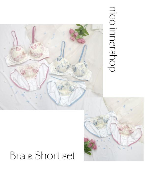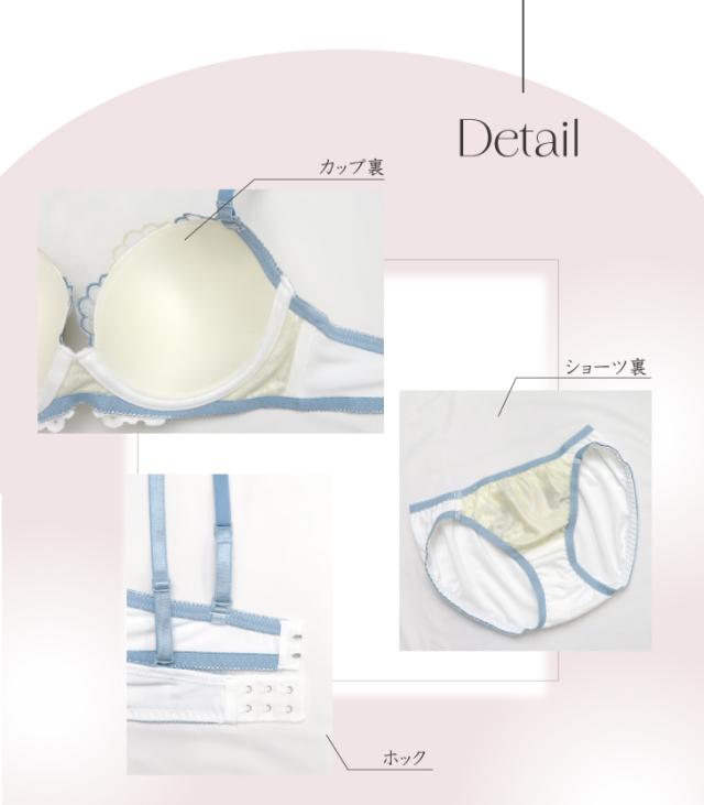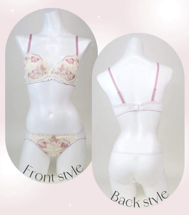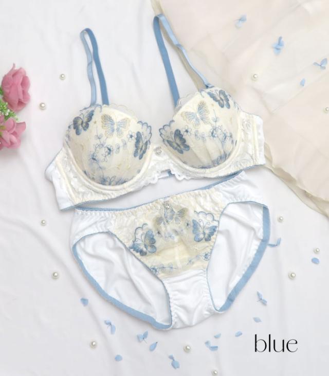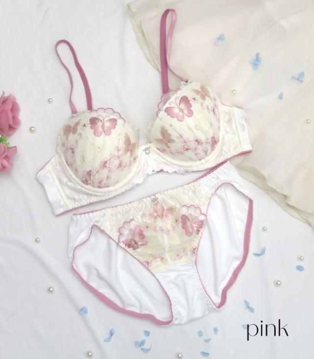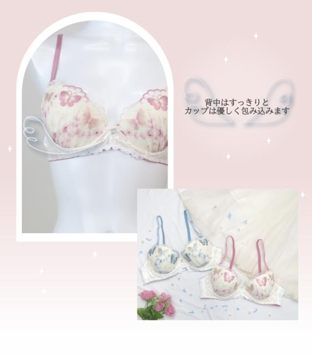 上品なバタフライ刺繍が華やかに映えるブラジャー&ショーツセット。繊細なレースと透明感のあるデザインが、フェミニンな雰囲気を演出します。バストをし優しく支えるモールドカップで、快適なフィット感を実現。甘く優しいピンクと、爽やかで落ち着いたブルーの2色展開。特別な日にはもちろん、デイリーにも取り入れたい大人の可愛らしさを詰め込んだ一着です。自分へのご褒美にもおすすめ。