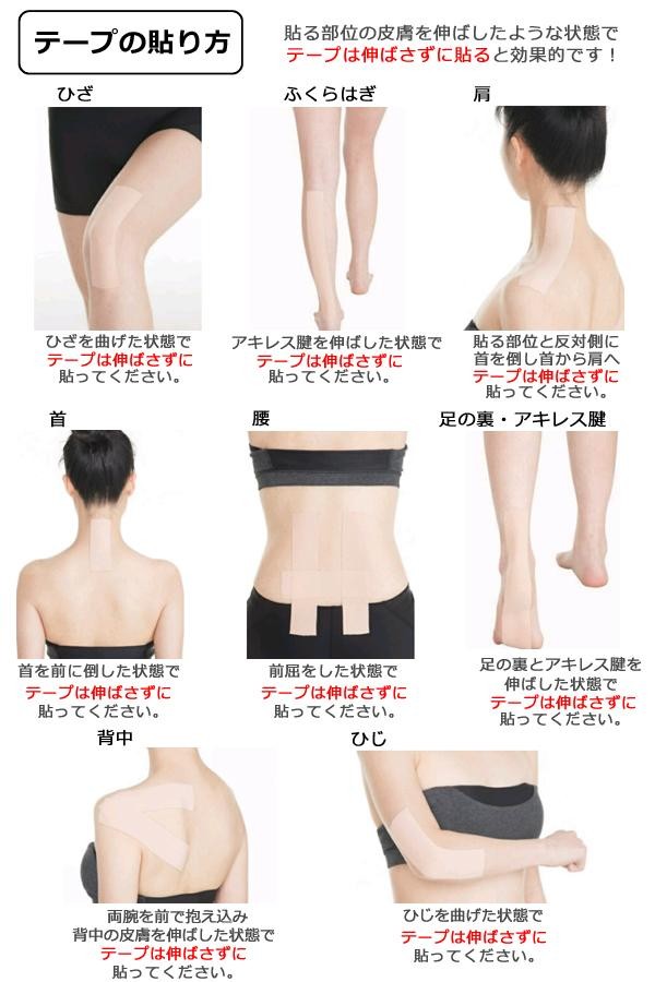 テープを貼る部分の筋肉をよく伸ばし貼ってください。キズ、炎症の箇所には使用しないでください。