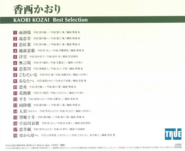 香西かおり CD ベスト・セレクション 18曲 ベストアルバム 雨酒場 流恋草 ヒット曲 演歌 歌謡曲 昭和の名曲 TRUE-1010 メール便送料無料